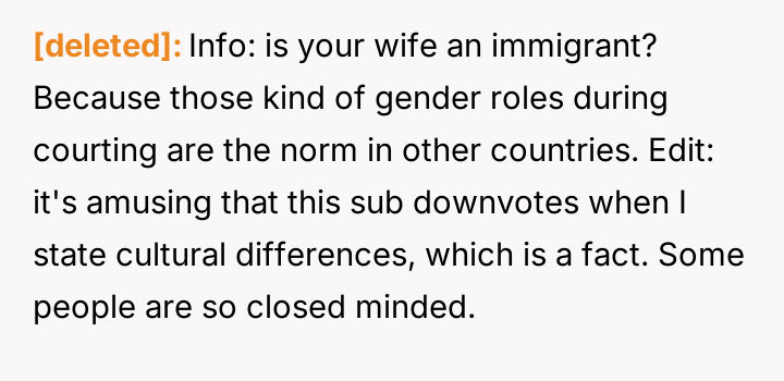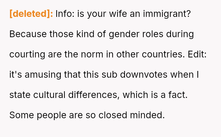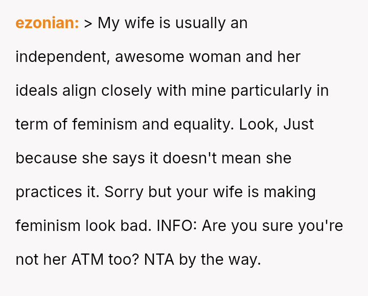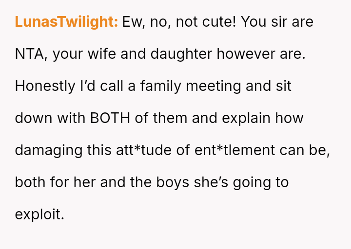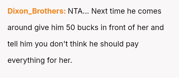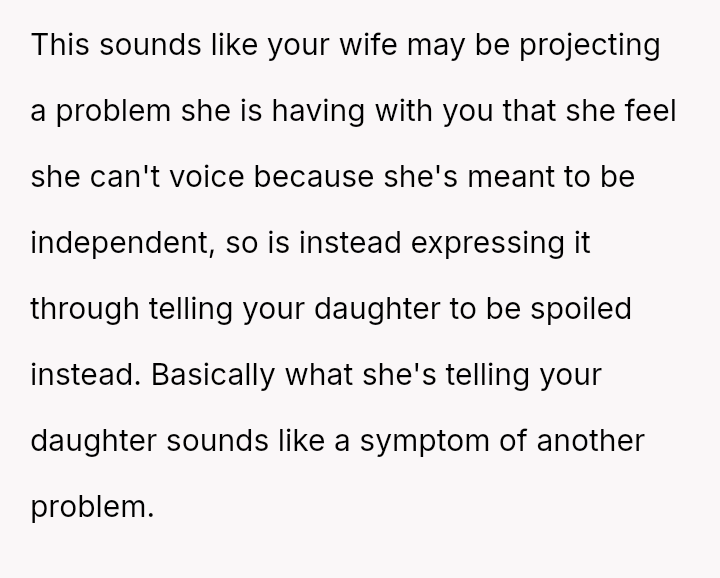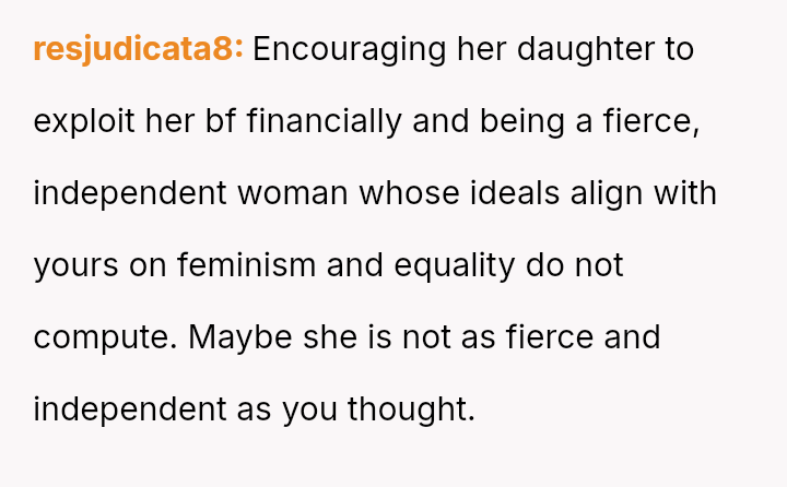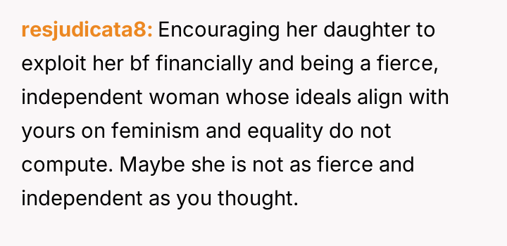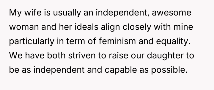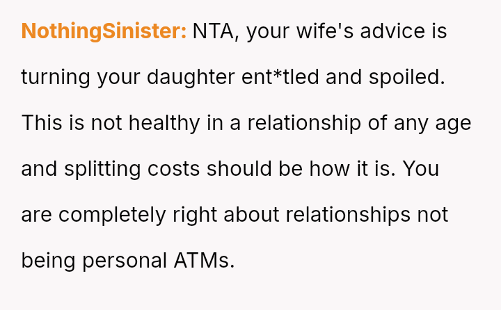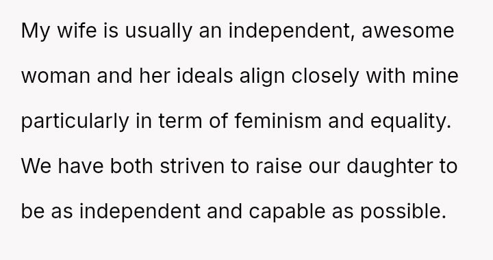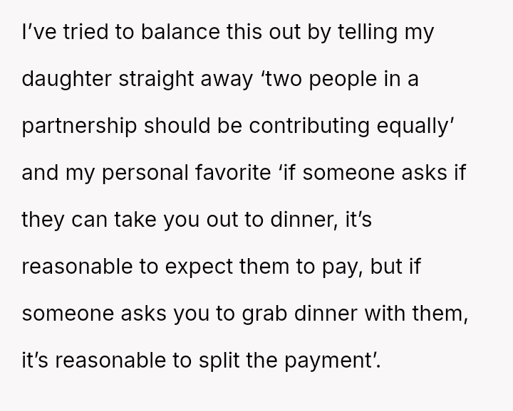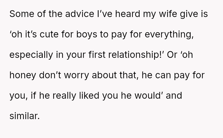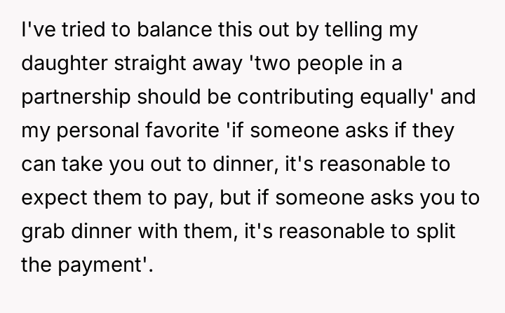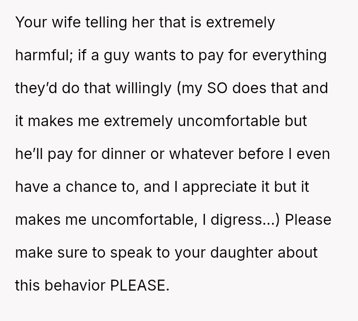 Given that the OP and wife have es**blished beliefs in equality, the central question is whether encouraging a young woman to accept financial exploitation under the guise of romantic tradition undermines the principles of independence they aimed to instill, and how this internal disagreement should be managed without damaging the parental relationship or the daughter's developing values?