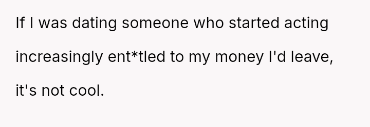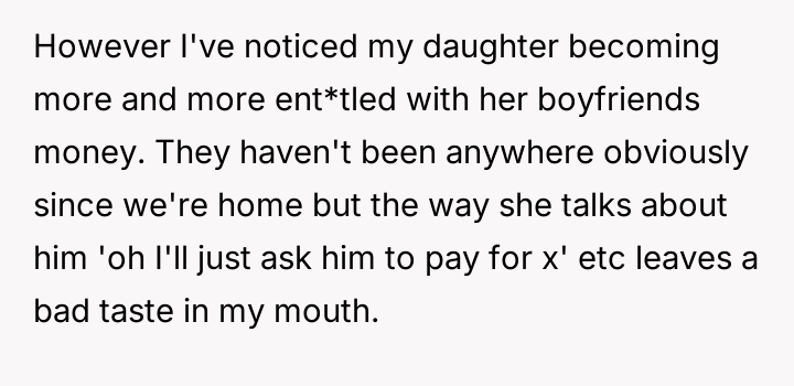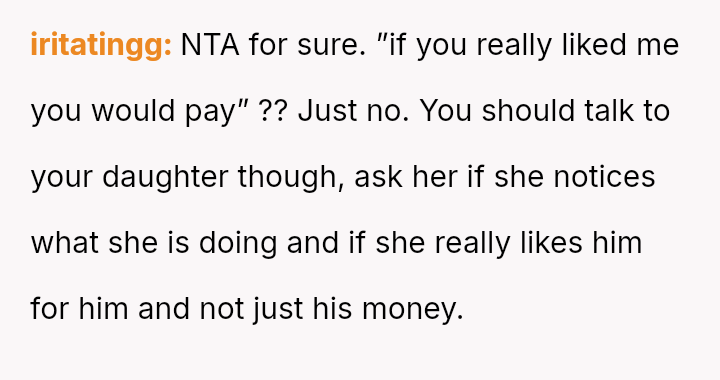 The original poster is facing a significant conflict stemming from a difference in parenting philosophy regarding financial expectations in their daughter's new relationship.
