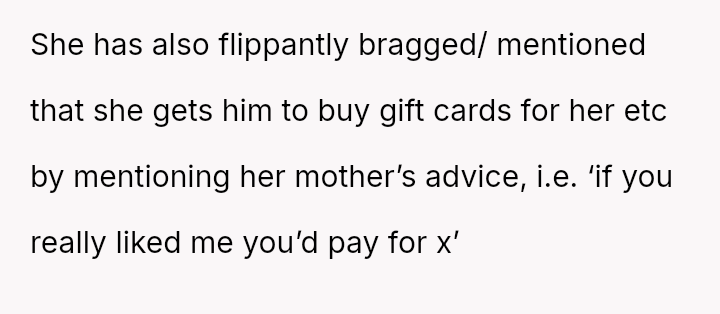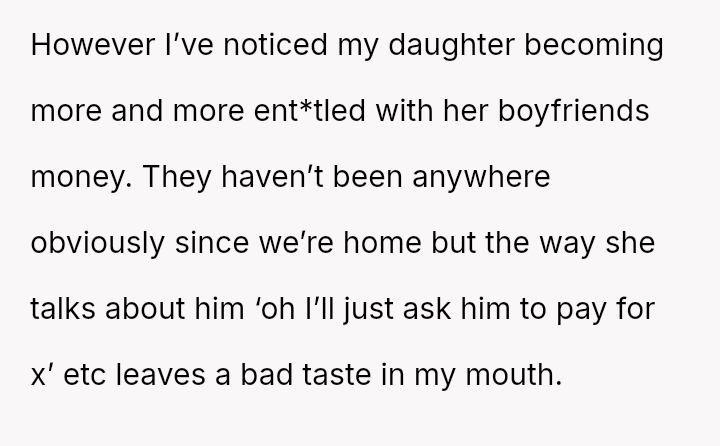 While the OP champions equality and independent contribution, the wife is actively encouraging the daughter to accept financial benefits from her boyfriend, justifying it as a traditional or "cute" dating phase.