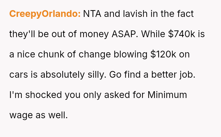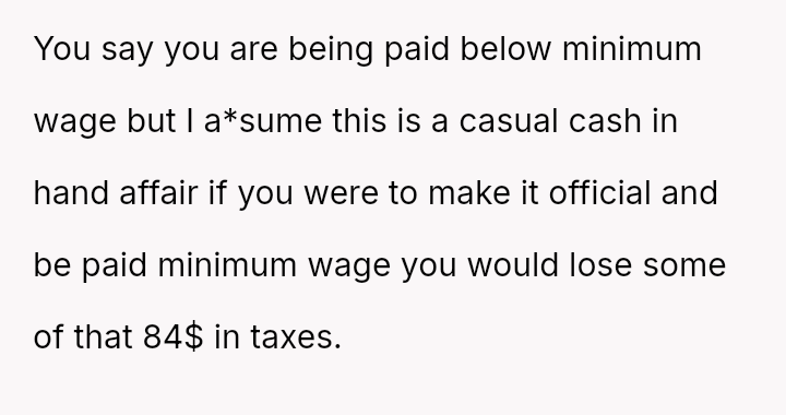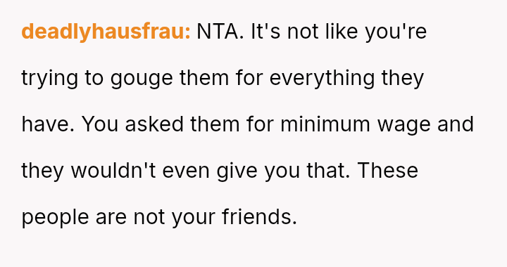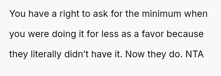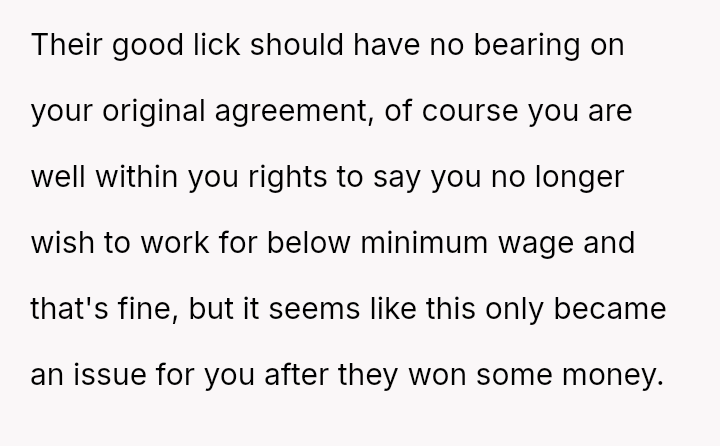 The core conflict arises when the friend receives a significant financial windfall but refuses to adjust the compensation to at least minimum wage, leading the OP to terminate the arrangement.
