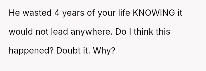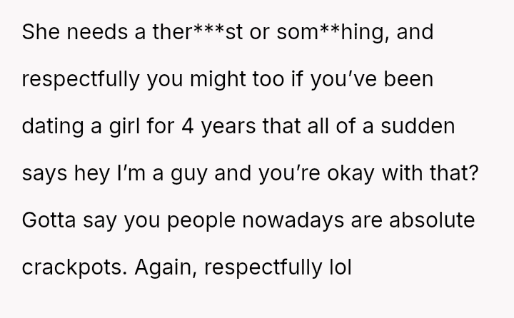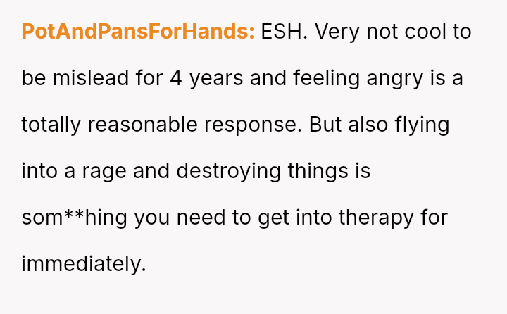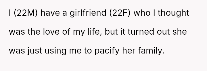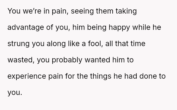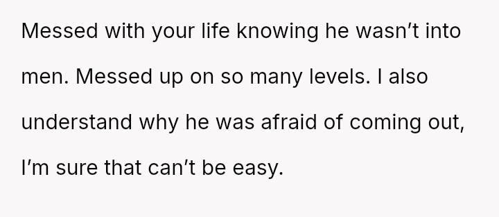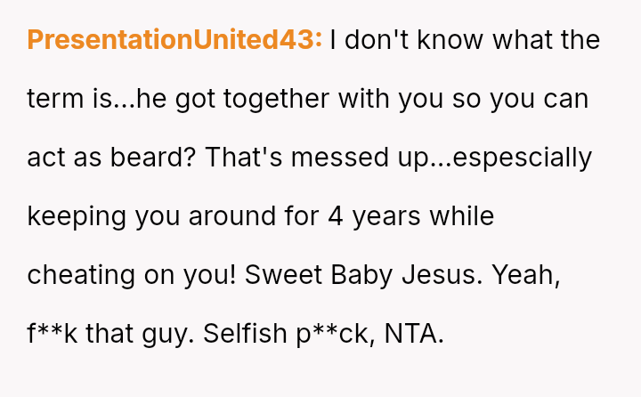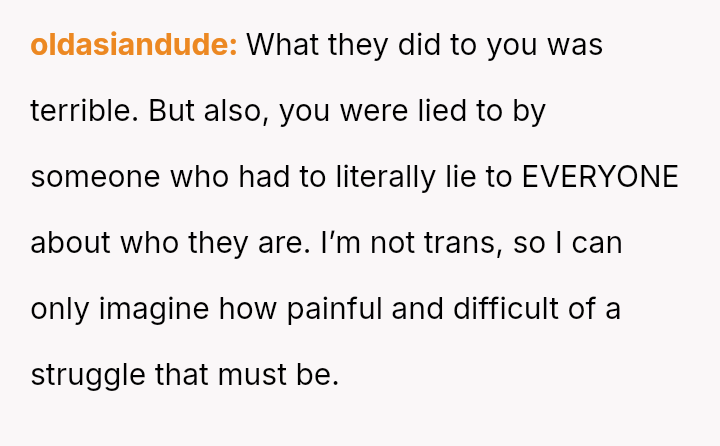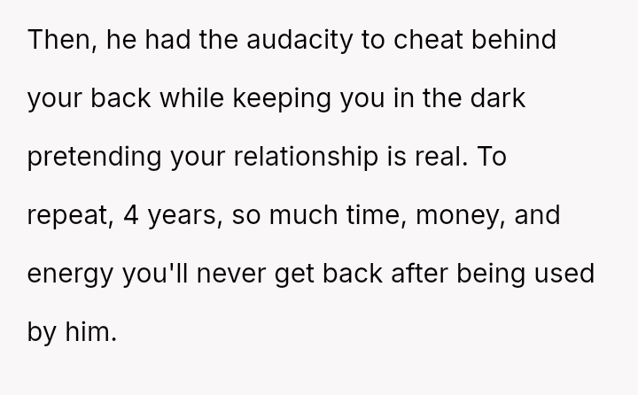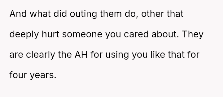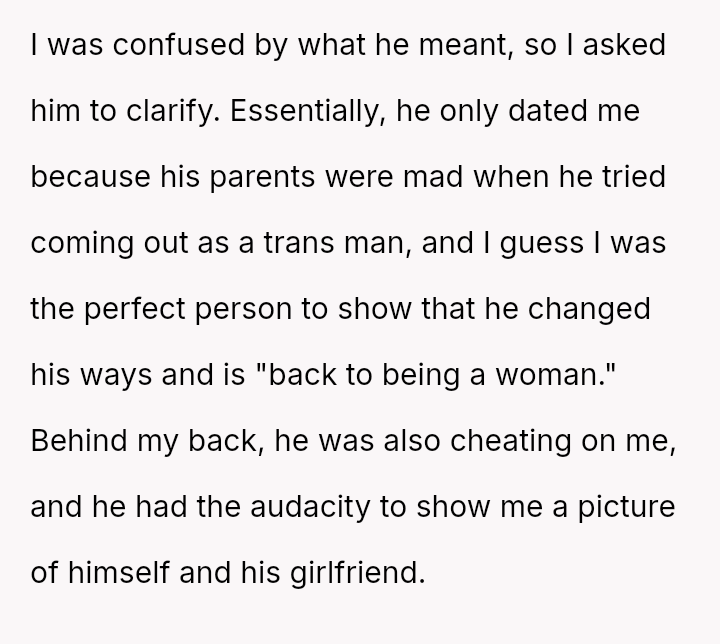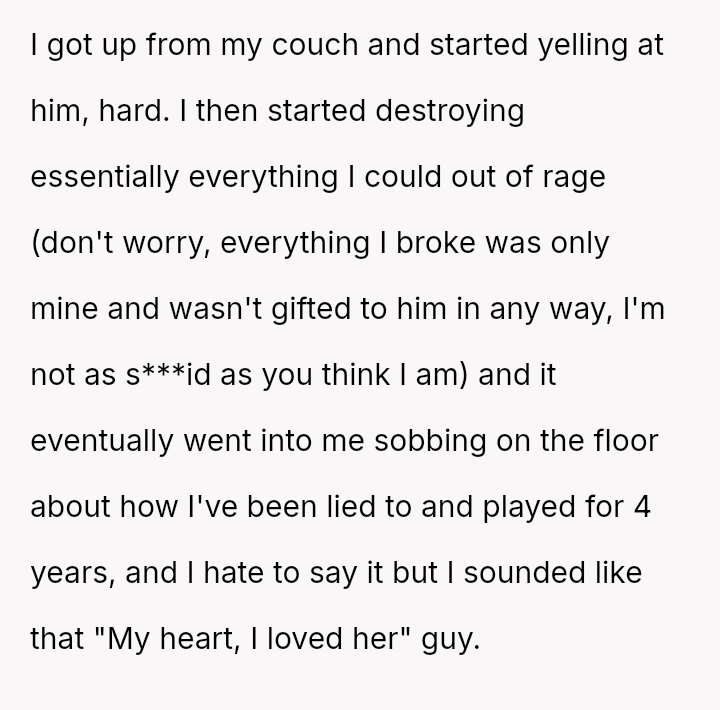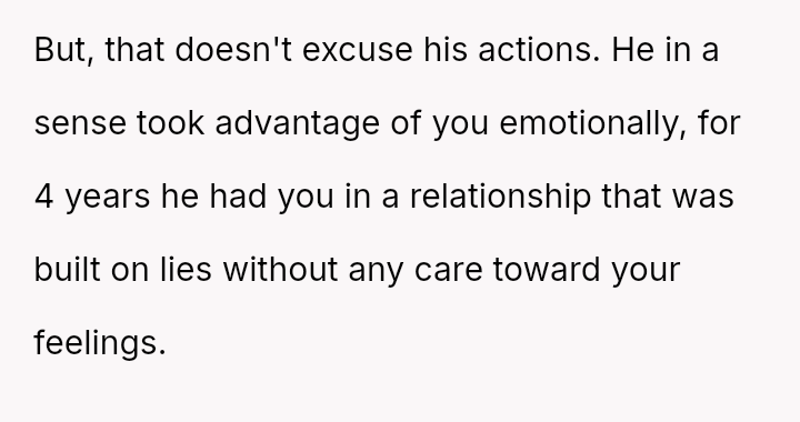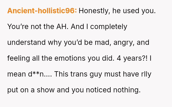 The original poster is grappling with intense feelings of betrayal and anger after discovering his four-year relationship was based on a significant deception, where his partner was using him to appease family expectations regarding his gender ident*ty.