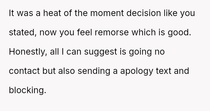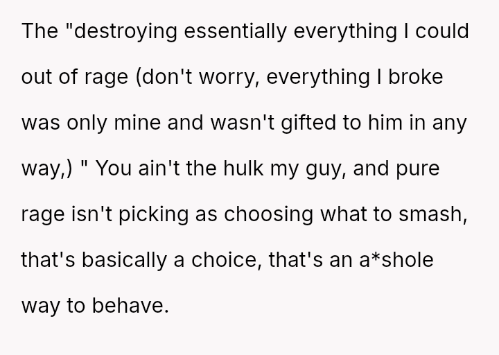 While his explosive reaction, including property damage and retaliatory contact with the partner's father, stemmed from deep emotional pain, he now recognizes the severity and negative impact of his actions, leading to feelings of guilt and regret.
