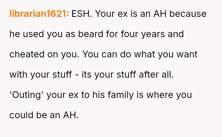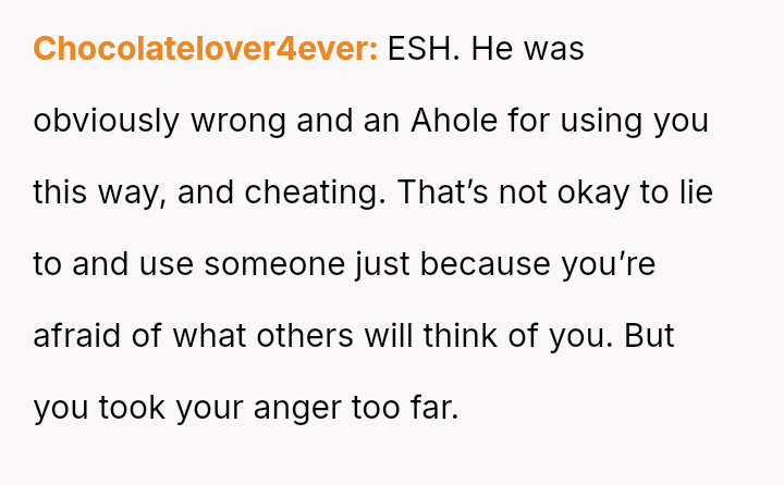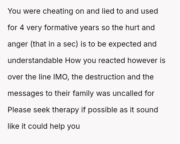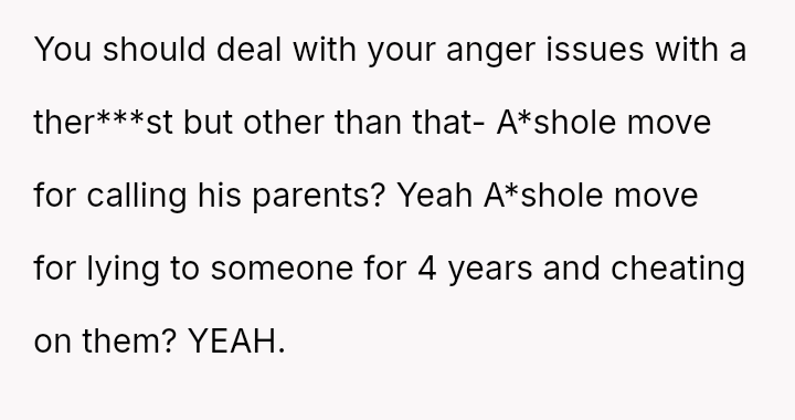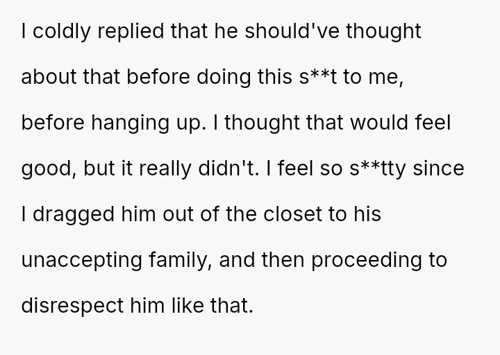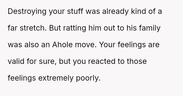 Given the OP's immediate regret over exposing his partner to his unaccepting family and the subsequent fallout, the central question becomes: Does the profound betrayal suffered justify the retaliatory actions taken, or does the OP's es**blished history of anger issues absolve him of full responsibility for the resulting harm to his ex-partner's situation?