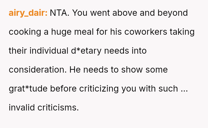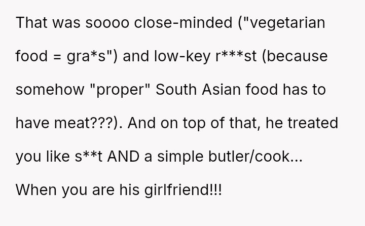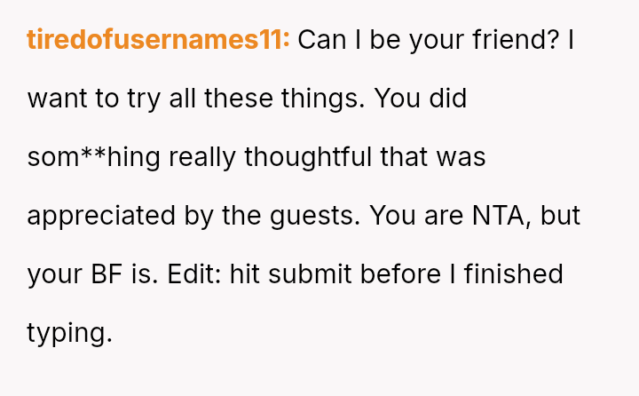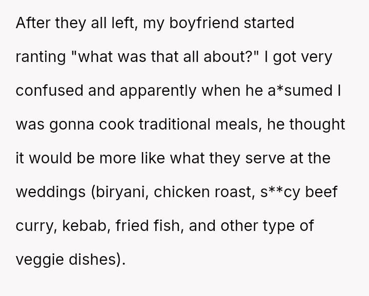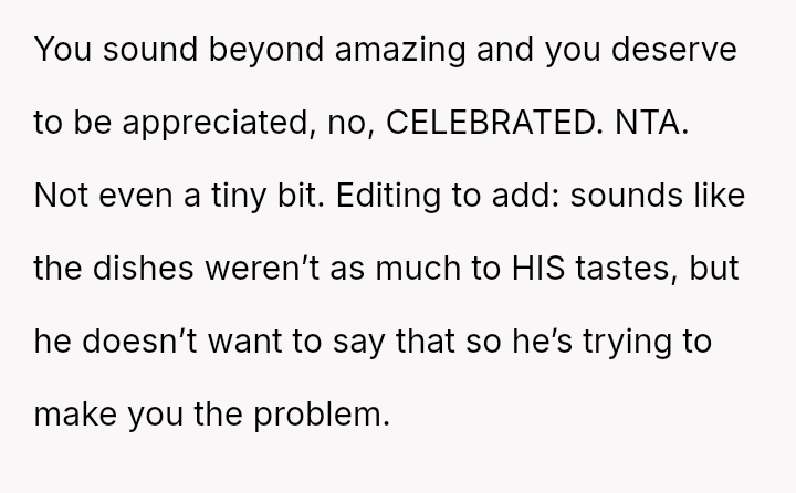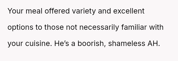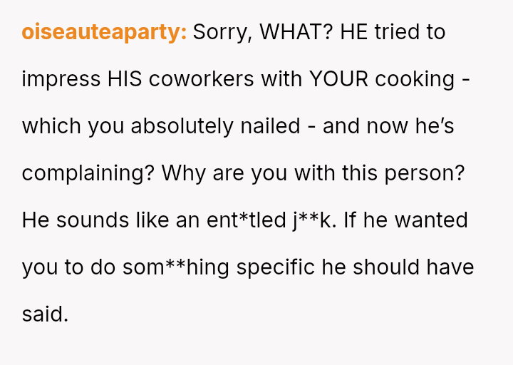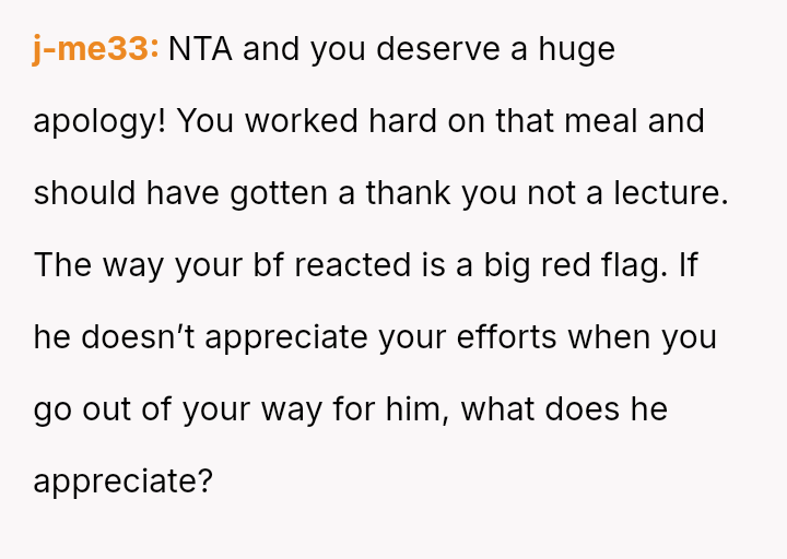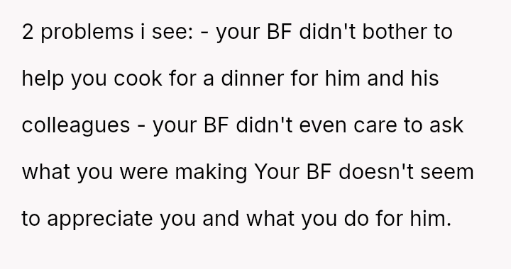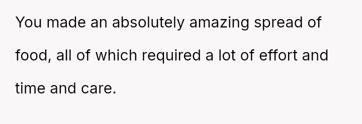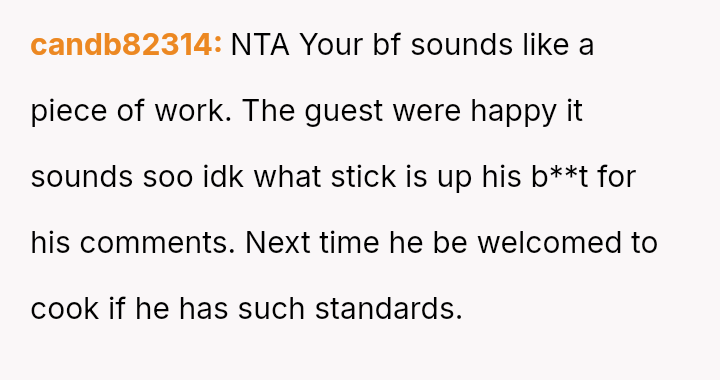 Given the disparity between the OP's genuine effort and the boyfriend's harsh criticism regarding perceived social standards, the core question is whether the boyfriend was justified in prioritizing external guest perception over appreciating the thoughtful effort presented, or if his reaction const*tuted an unfair dismissal of the OP's culinary contribution.