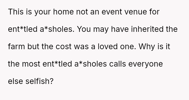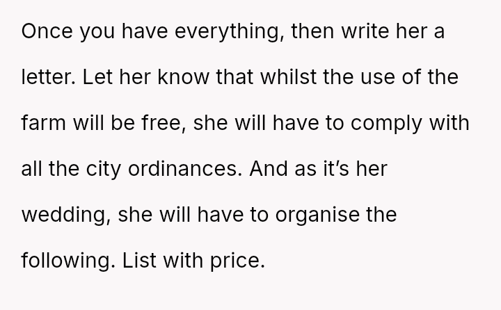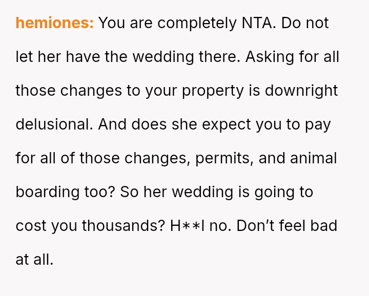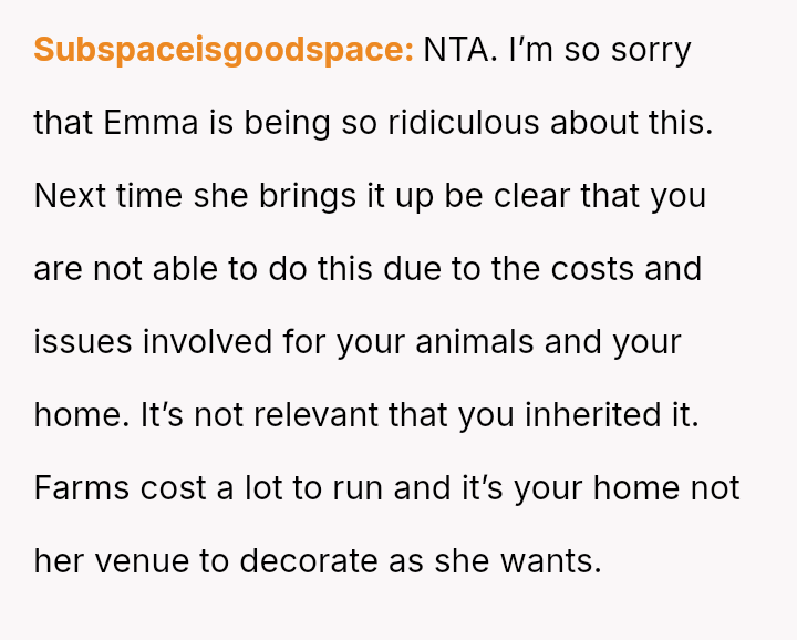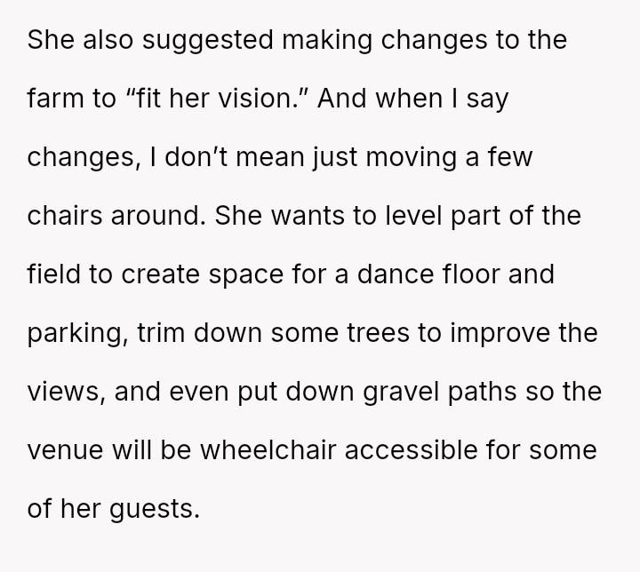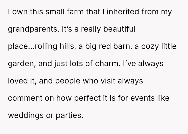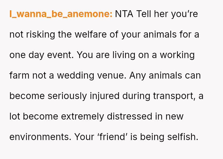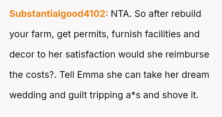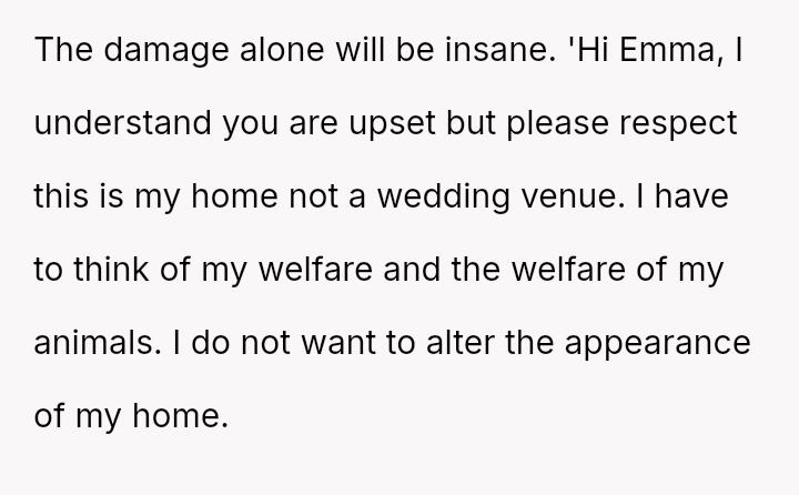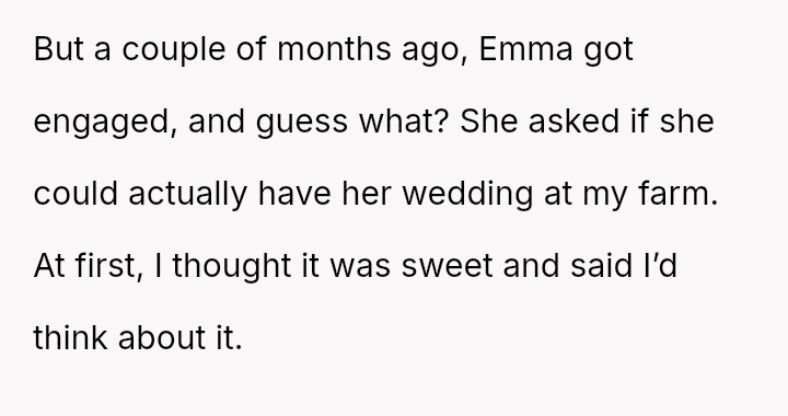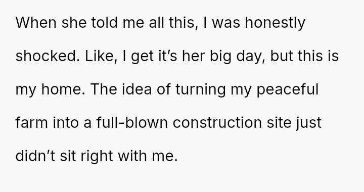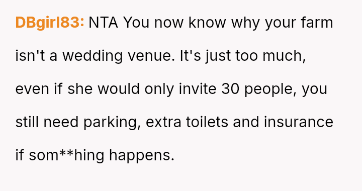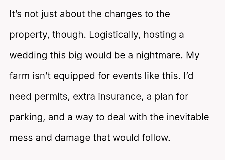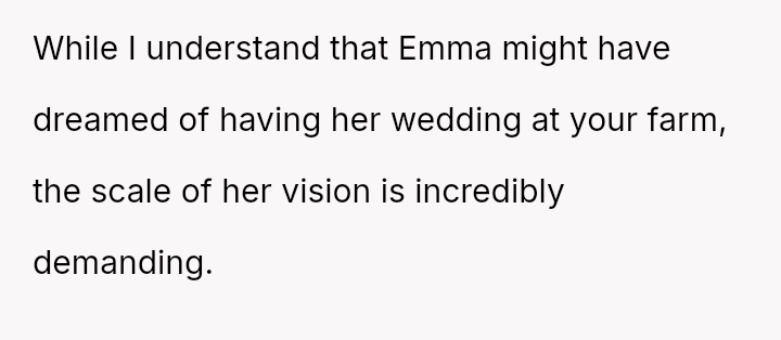 While the OP initially felt guilt for declining their friend Emma's request, they firmly believe the proposed large-scale wedding, complete with significant structural changes to the farm, imposes an unreasonable burden and threat to their home and lifestyle.