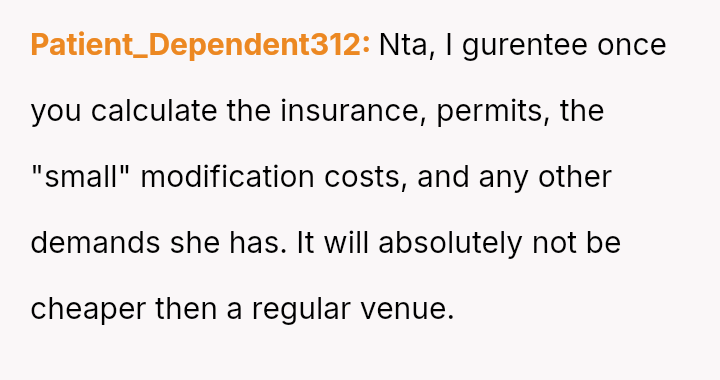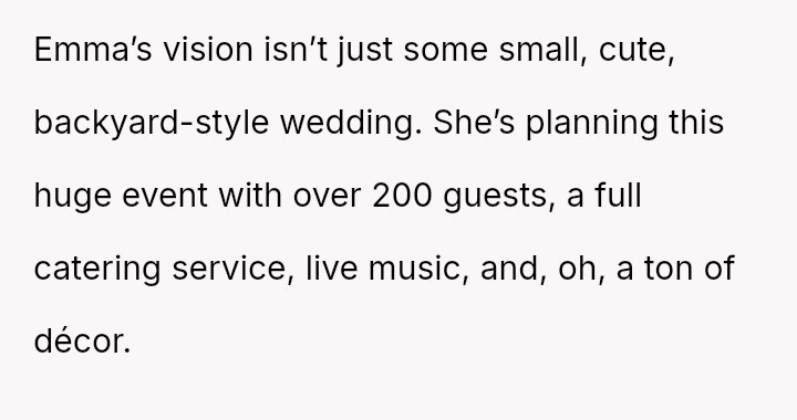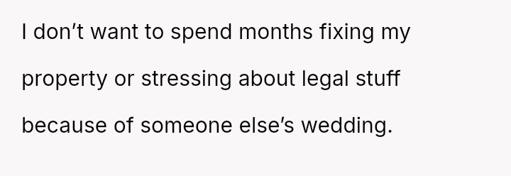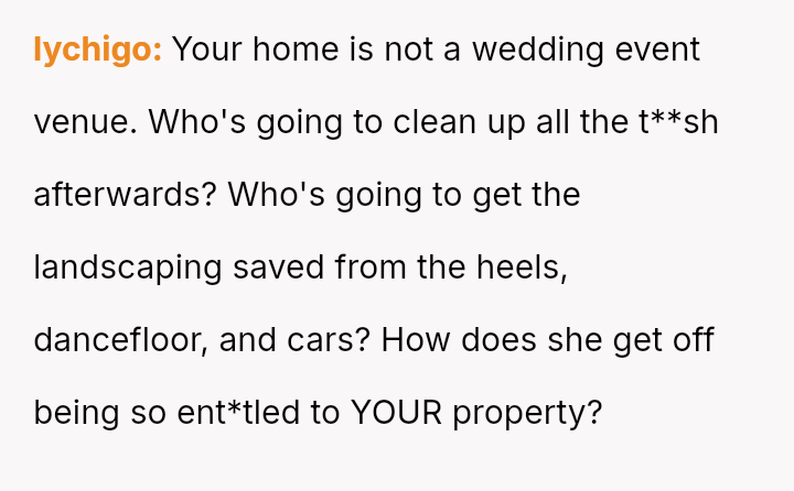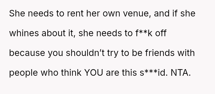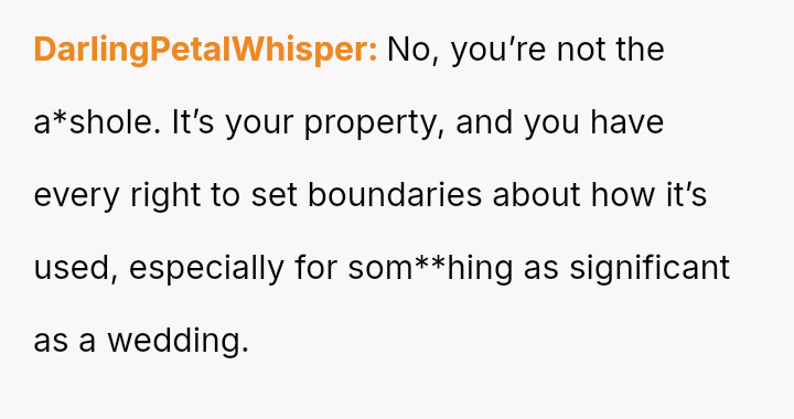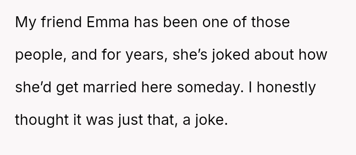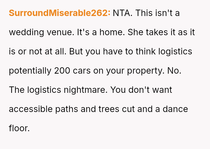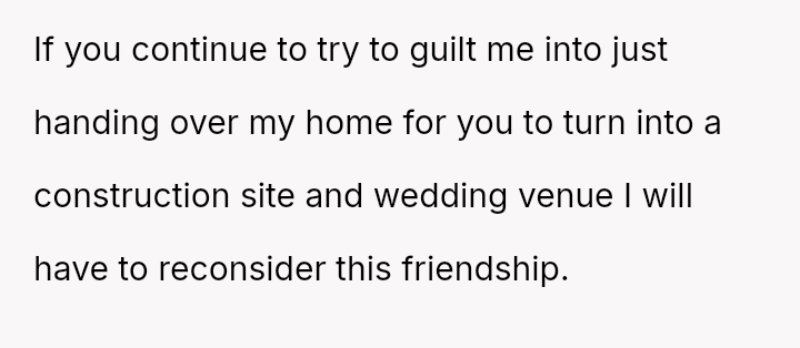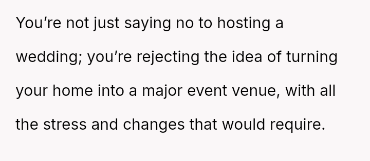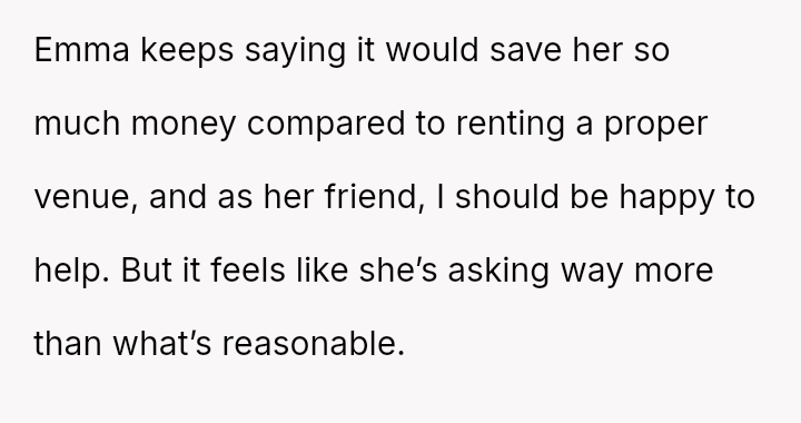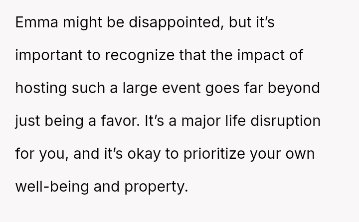 The central question is whether the OP was wrong (an 'a*shole') to refuse hosting a ma*sive wedding that required fundamental alterations to their private property, or if the friend, Emma, was unreasonable in demanding such extensive use and modification of a space that is not a commercial venue. Where should the boundary lie between friendship expectations and property rights?