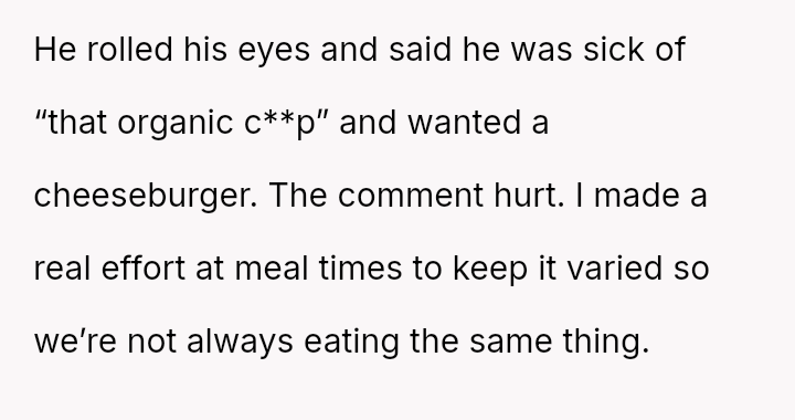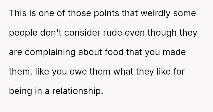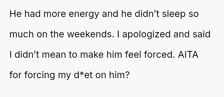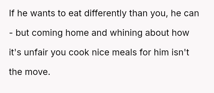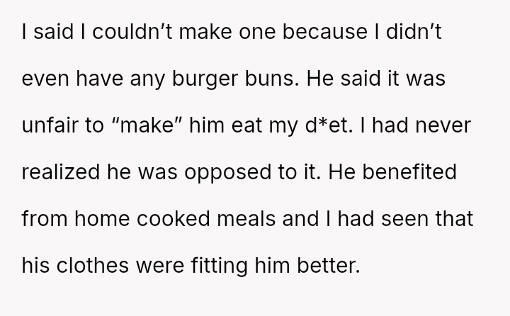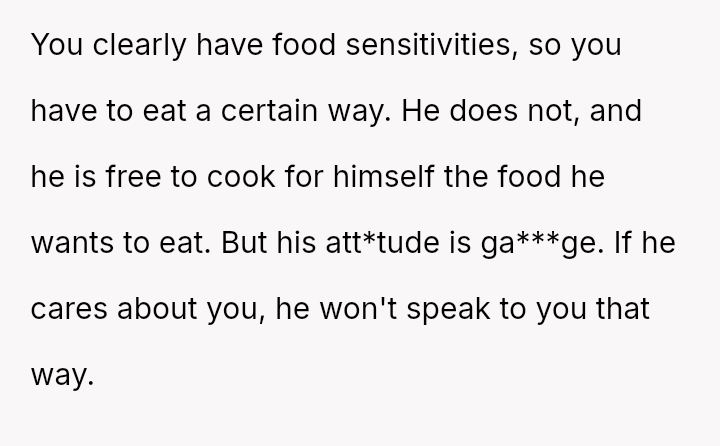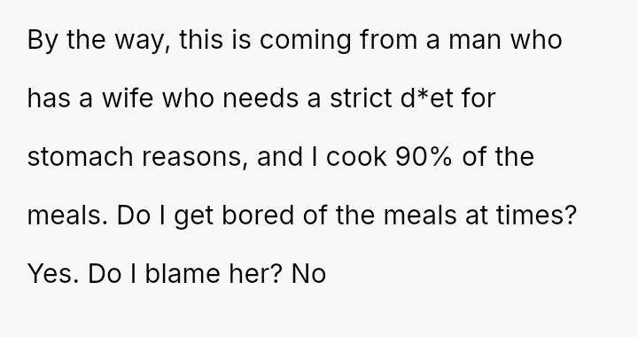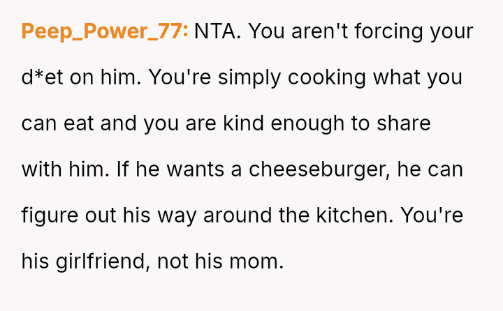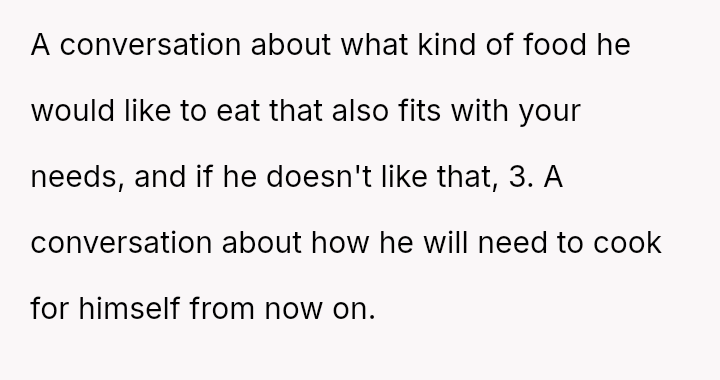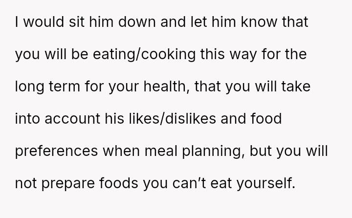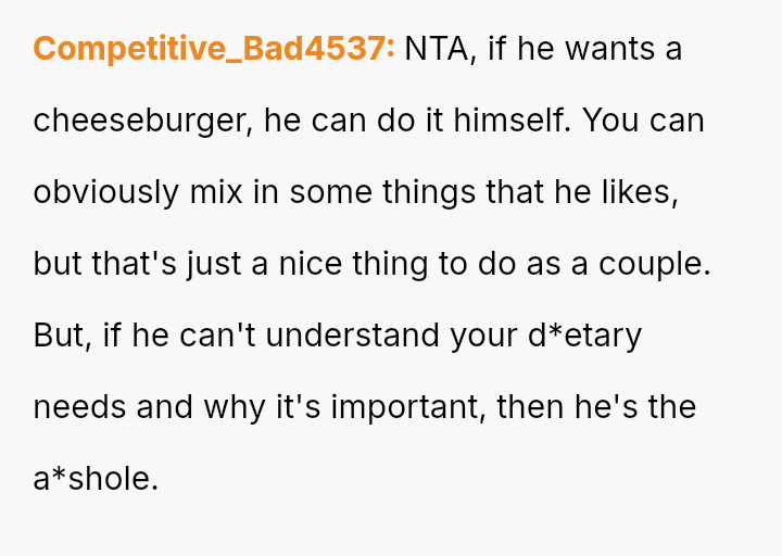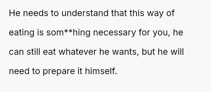 Given that the OP's d*et is medically necessary to prevent illness, is it reasonable for the partner to feel excluded or 'forced' to eat the same food, or should the partner prioritize supporting the OP's health requirements even if it means compromising on meal choices? Is the OP unfairly imposing their d*et, or is the partner displaying a lack of necessary empathy?