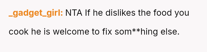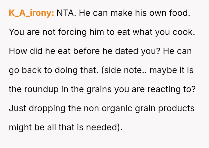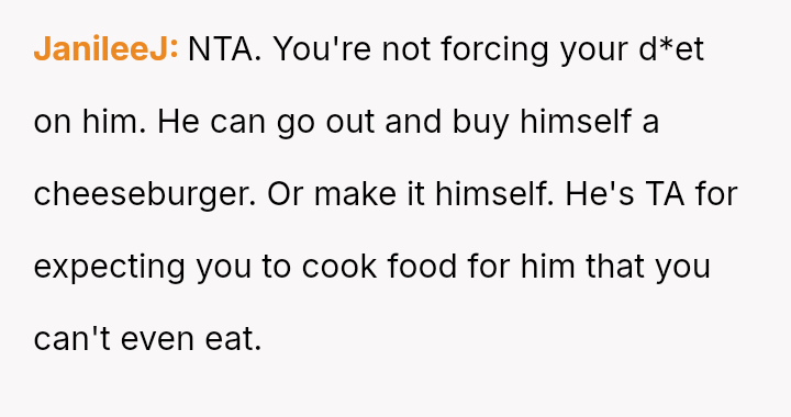 The central conflict arises when the OP's necessary health adjustments clash with their partner's expectations regarding shared meals, leading to feelings of hurt and misunderstanding over whose needs should take priority in the relationship.