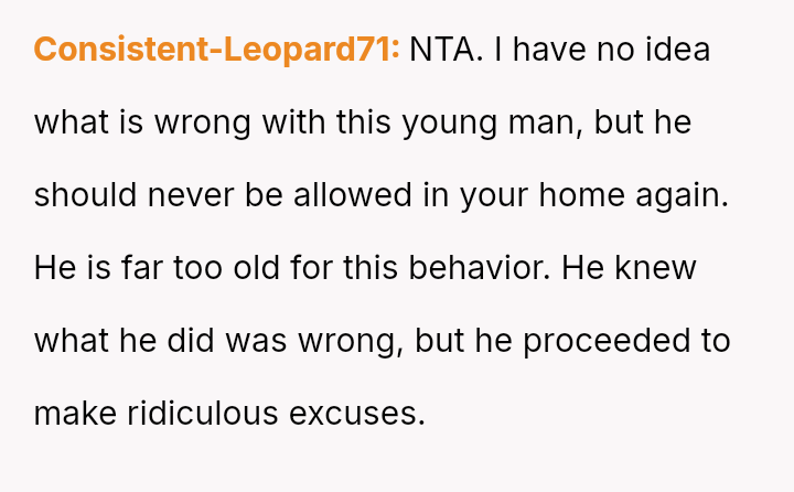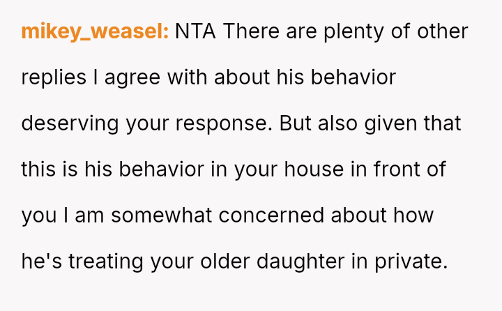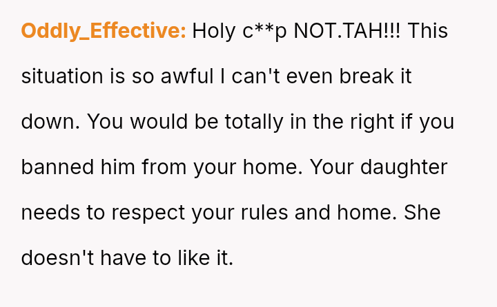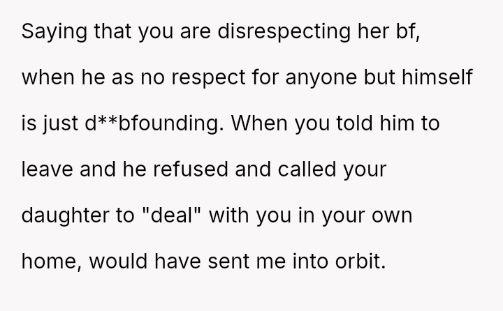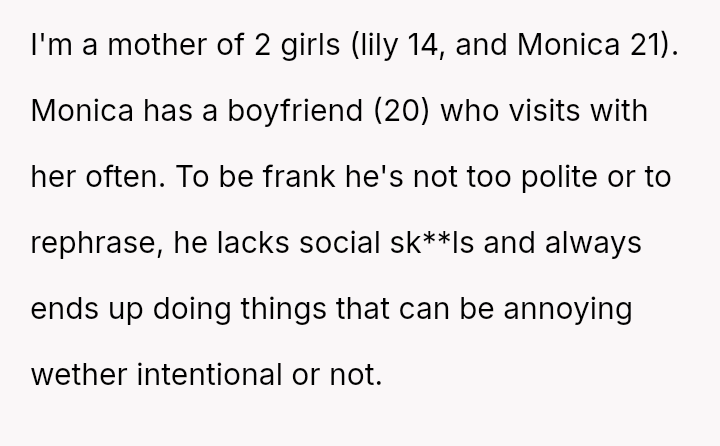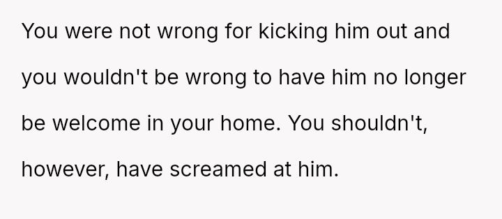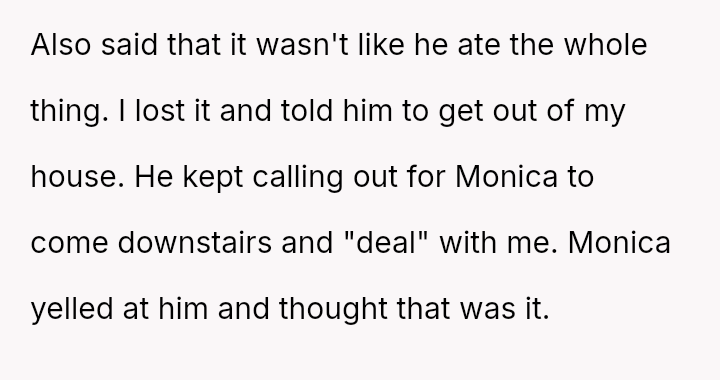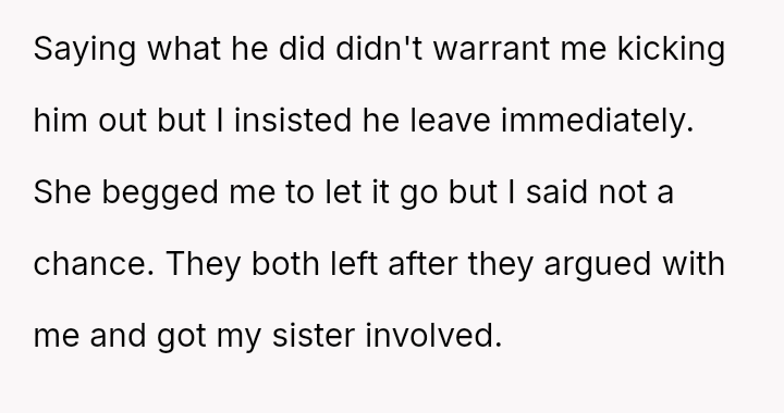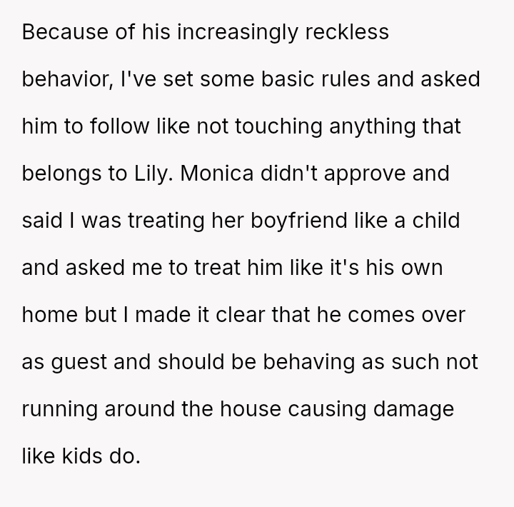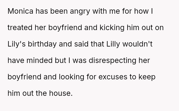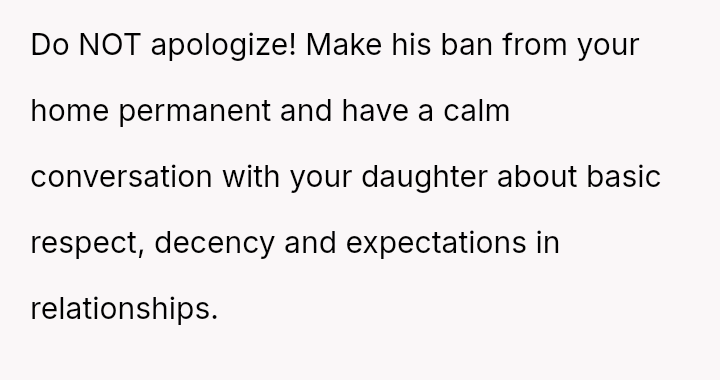 The OP reacted strongly by immediately evicting him from the home, leading to conflict with both the boyfriend and the older daughter, Monica, who felt her boyfriend was disrespected and that the punishment was too severe for the offense.