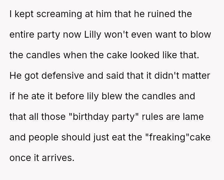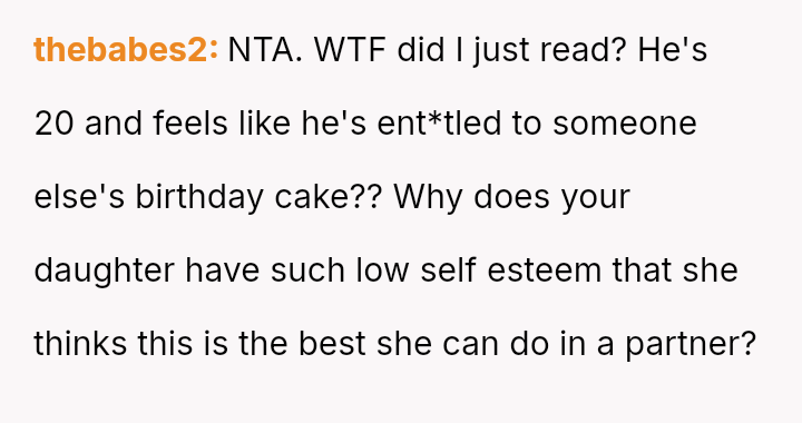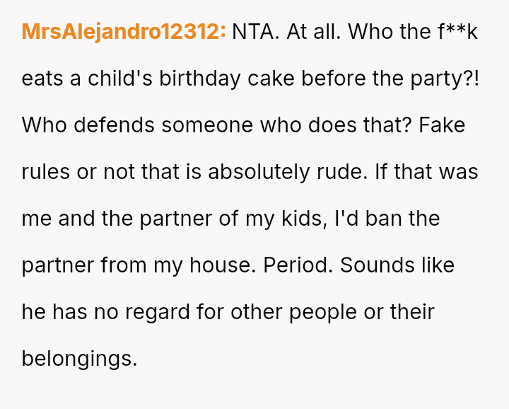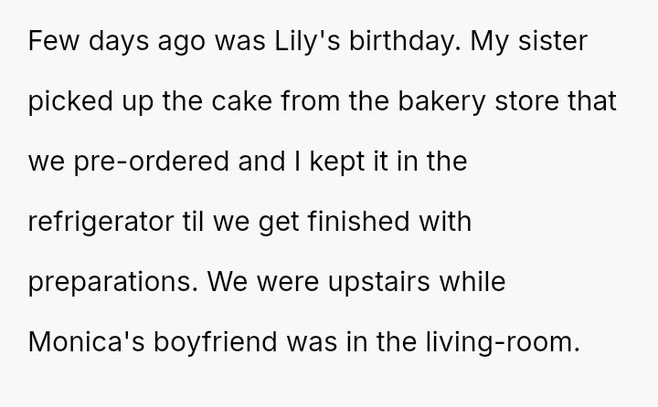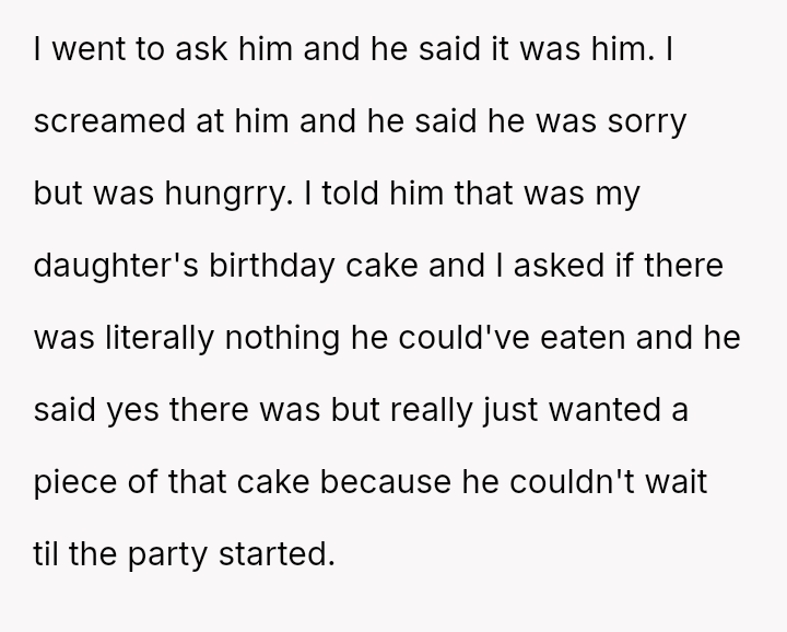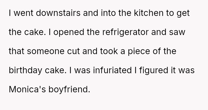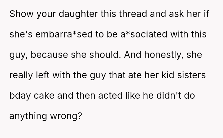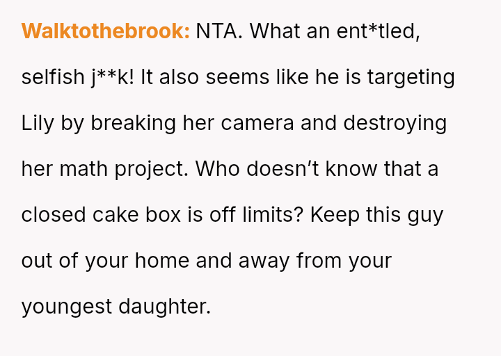 The original poster (OP) reached a breaking point due to the consistent disrespect and property damage caused by their daughter's boyfriend, culminating in him eating a piece of the birthday cake meant for the younger daughter before the celebration.