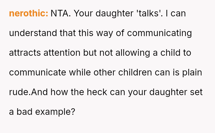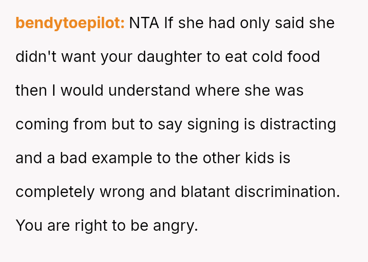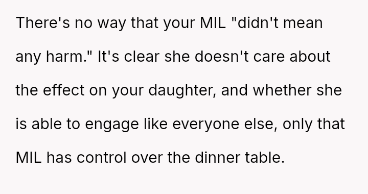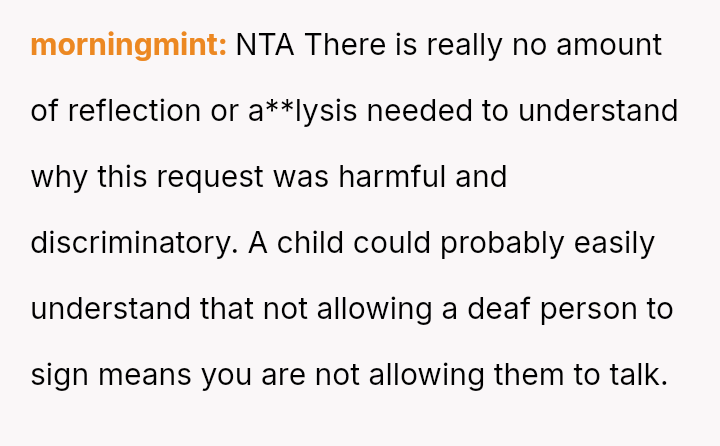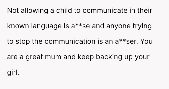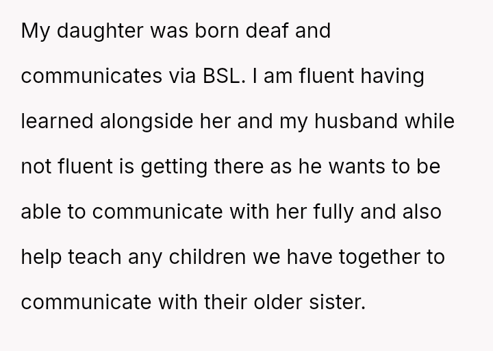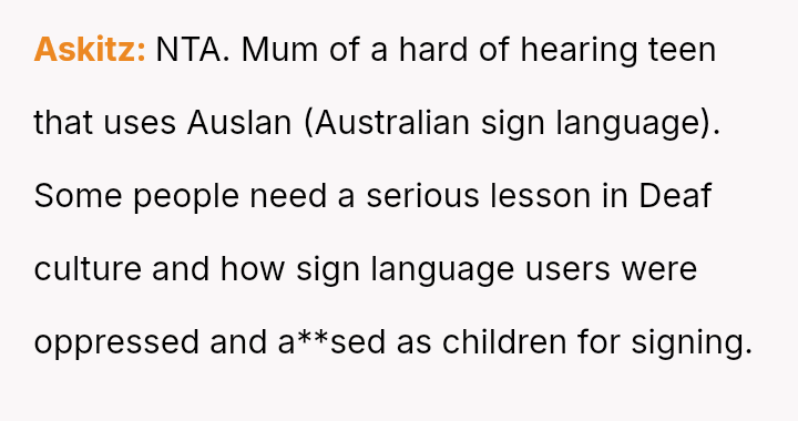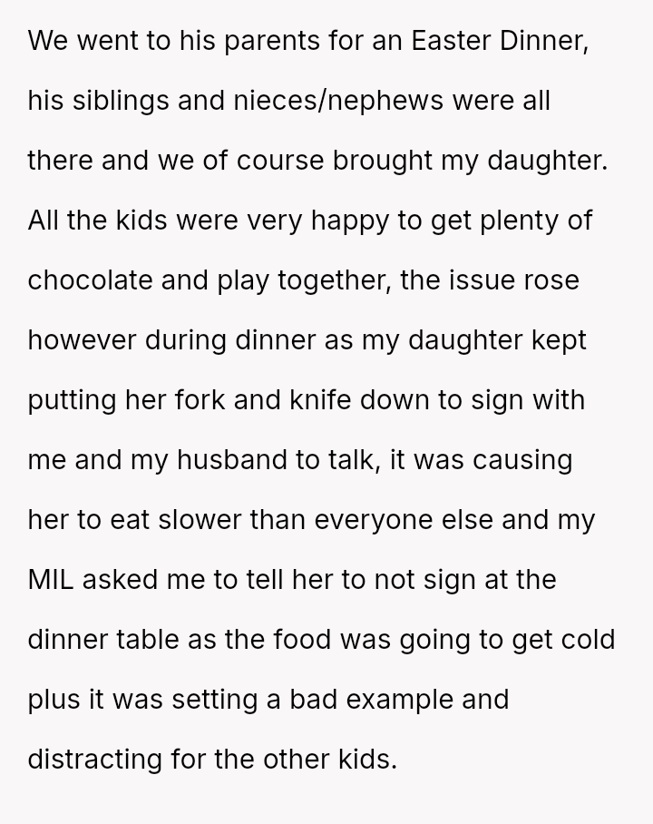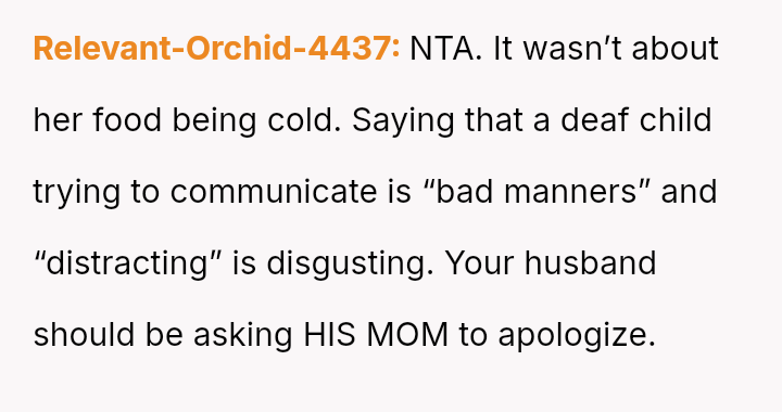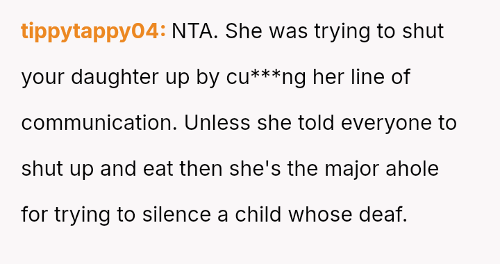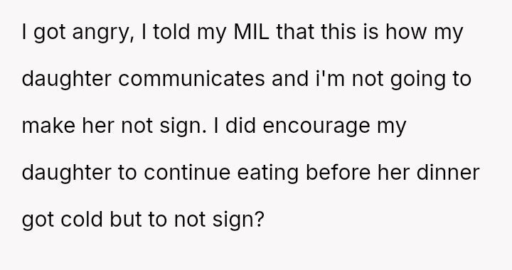 The original poster (OP) reacted strongly when her daughter's m**hod of communication (British Sign Language, BSL) was criticized at a family dinner by her mother-in-law (MIL).