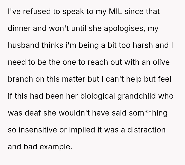 Should the OP maintain a firm stance, refusing contact until an explicit apology is made regarding the insensitivity shown toward her daughter's communication needs, or should she prioritize repairing the relationship with her husband's family by extending an olive branch first, acknowledging the MIL's lack of understanding?