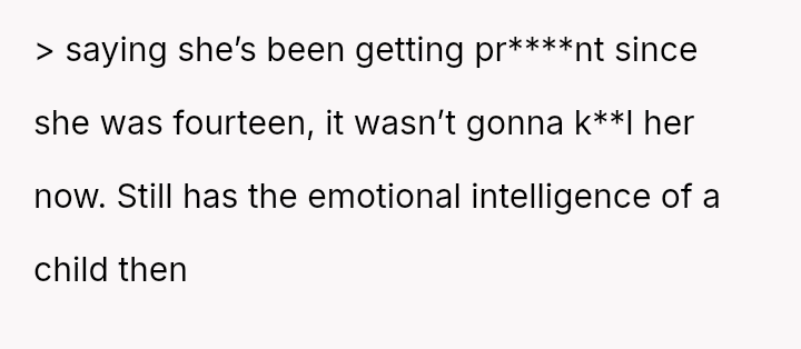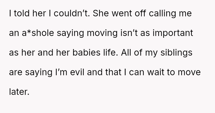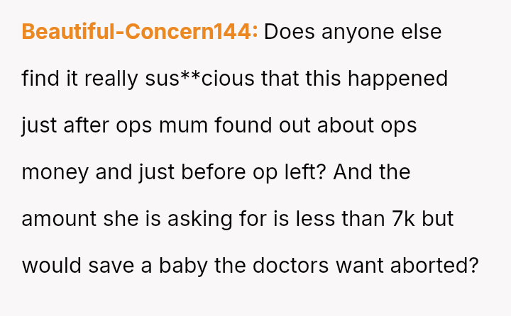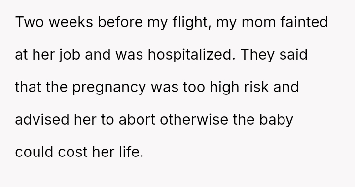 The mother frames the OP's planned departure as a selfish act, especially given the current high-risk pregnancy and hospitalization, creating a severe moral dilemma for the OP.