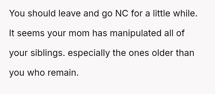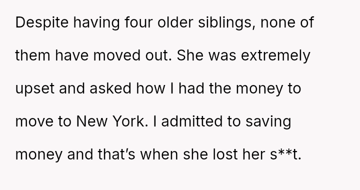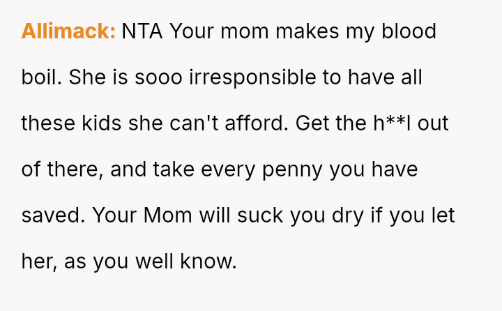 The original poster (OP) is experiencing intense conflict between their deeply held need for independence and self-preservation, demonstrated by years of saving and planning to move out, and the intense emotional demands and financial expectations placed upon them by their mother and siblings.