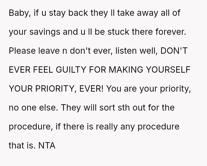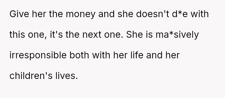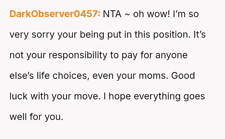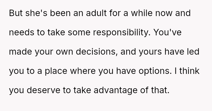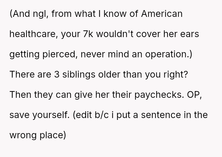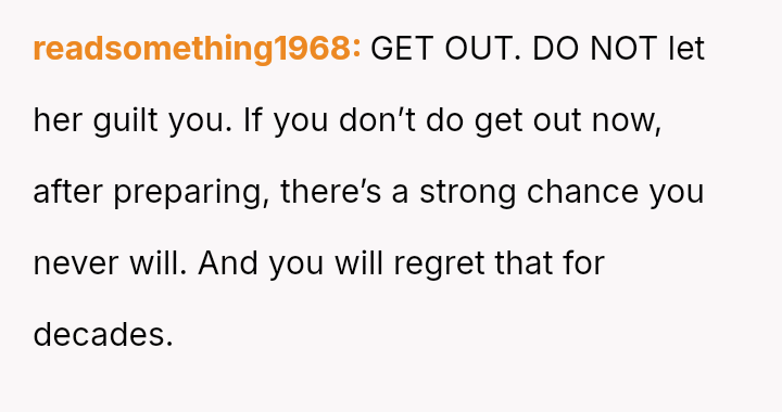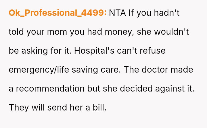 Given the OP's long-term commitment to self-sufficiency versus the immediate, life-threatening needs presented by the mother, is the OP morally obligated to sacrifice their secured future plans and savings to provide immediate financial relief, or is prioritizing their es**blished plan for personal autonomy the correct course of action in this high-pressure, multigenerational dependency situation?
