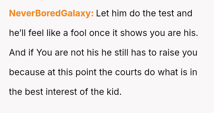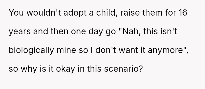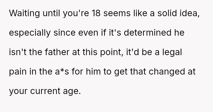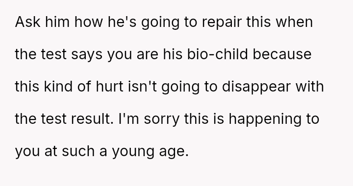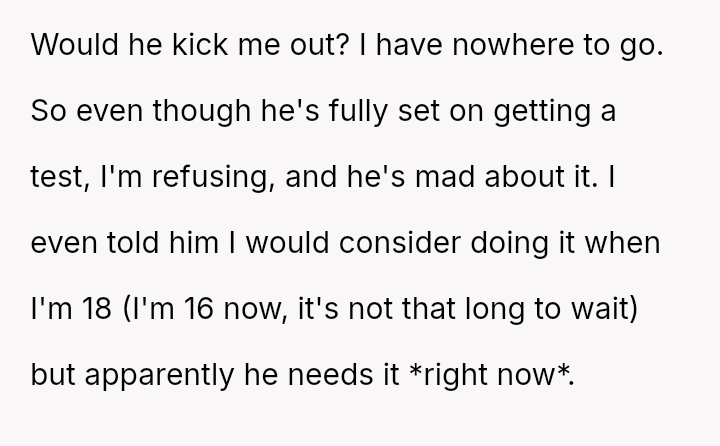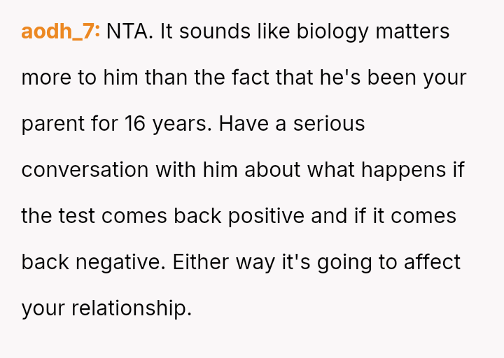Is the 16-year-old justified in refusing the immediate paternity test to protect their current relationship and emotional s**bility, or does the father have a right to demand biological confirmation now to resolve years of doubt, even if it causes immediate harm to his daughter?