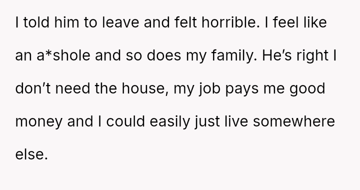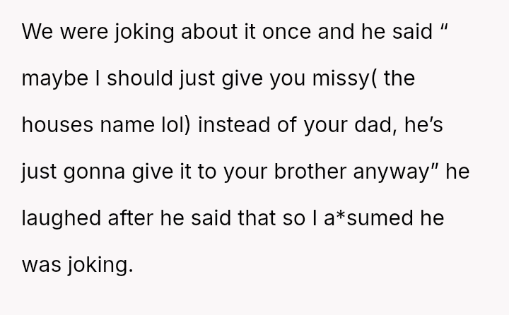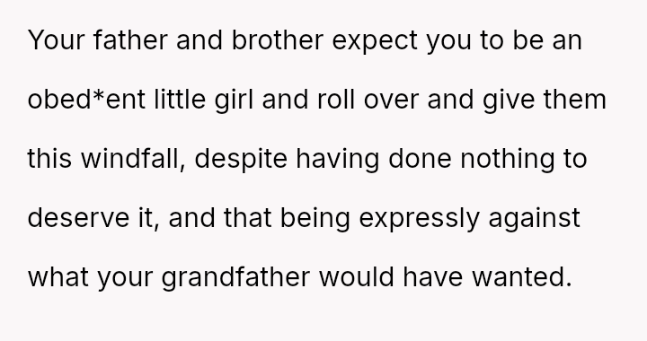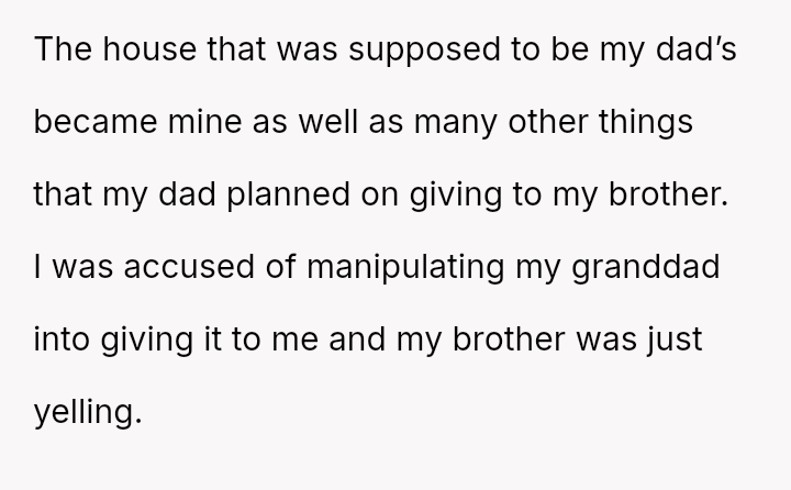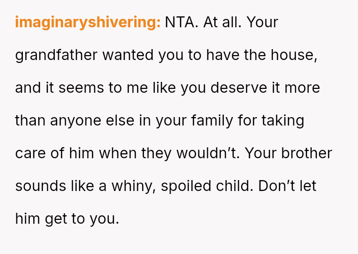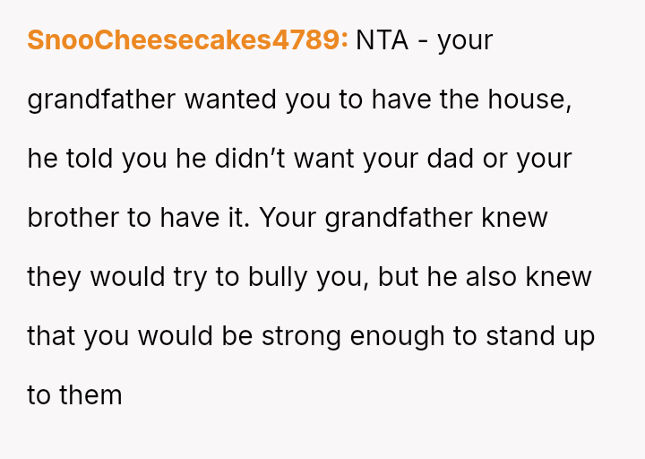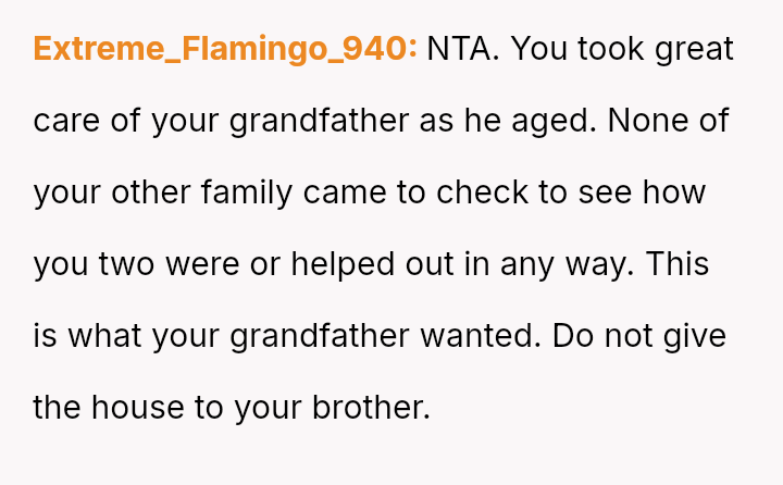 The original poster (OP) is caught in a difficult situation stemming from a promise or belief instilled by their grandfather regarding an inherited house, which directly conflicts with the expectations and emotional demands of their brother.