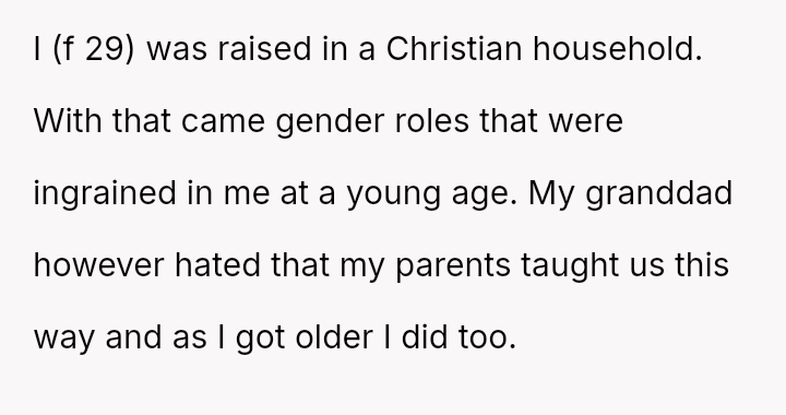 Growing up in a strict Christian household, she was confined by rigid gender roles that clashed with the love and understanding she found only in her grandparents.