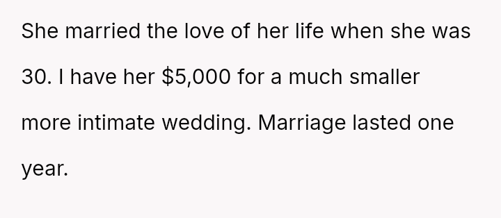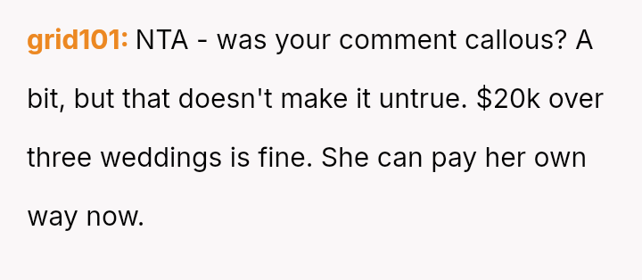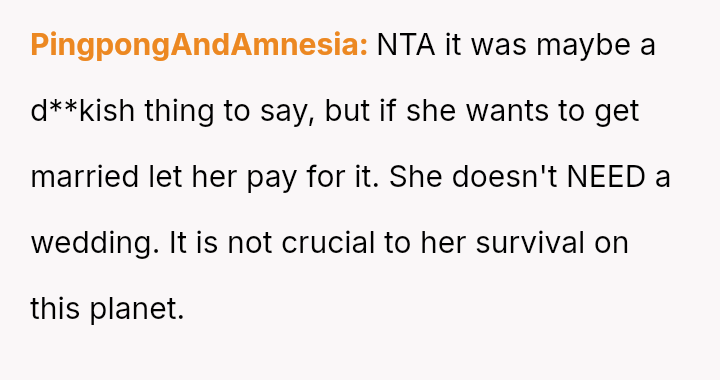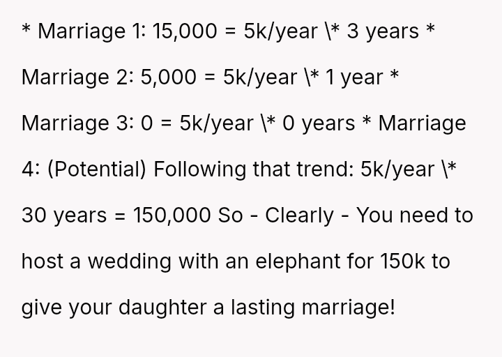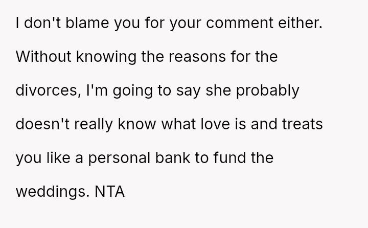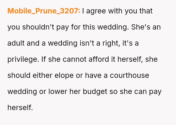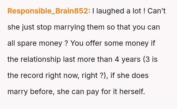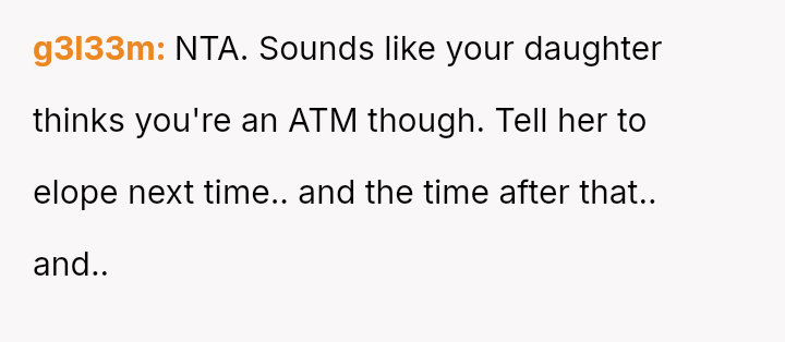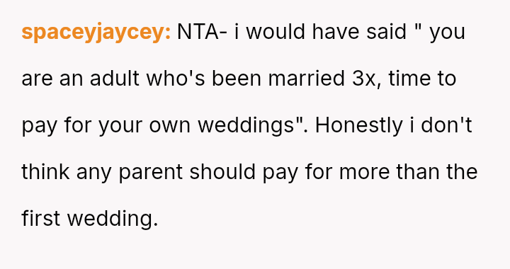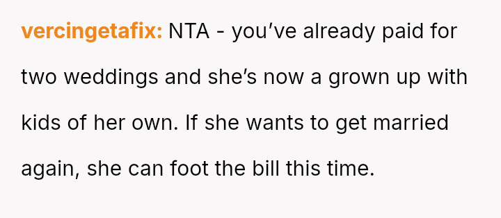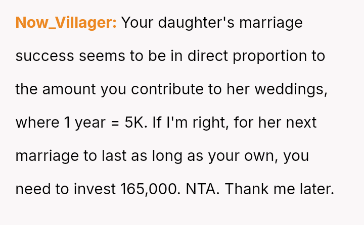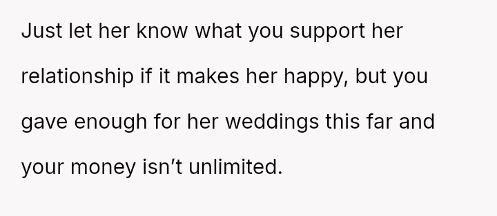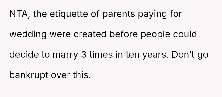 The father stands firm in his decision to withhold financial support for his daughter's fourth wedding, viewing his past contributions as failed investments and believing her repeated marital failures demonstrate a lack of commitment or understanding regarding long-term relationships.