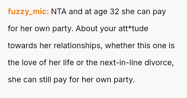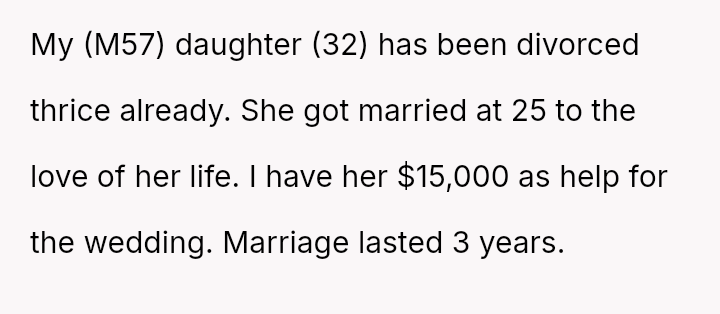 Is the father justified in refusing financial aid based on his daughter's past history of three failed marriages, or does his refusal const*tute an unsupportive action that prioritizes his own financial judgment over his daughter's present happiness and emotional needs?