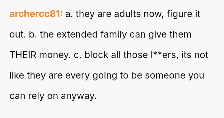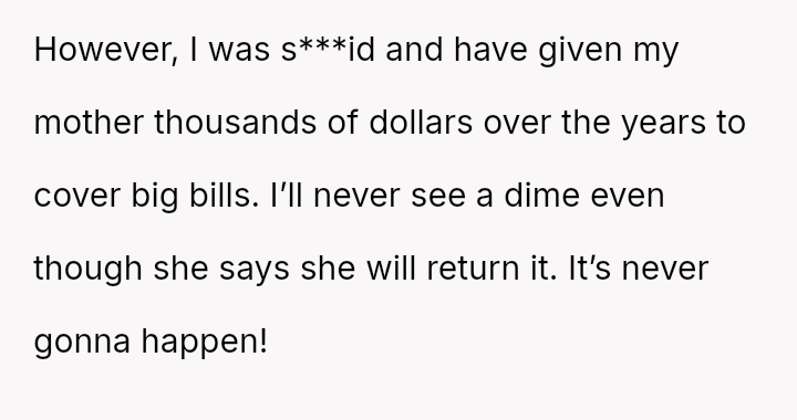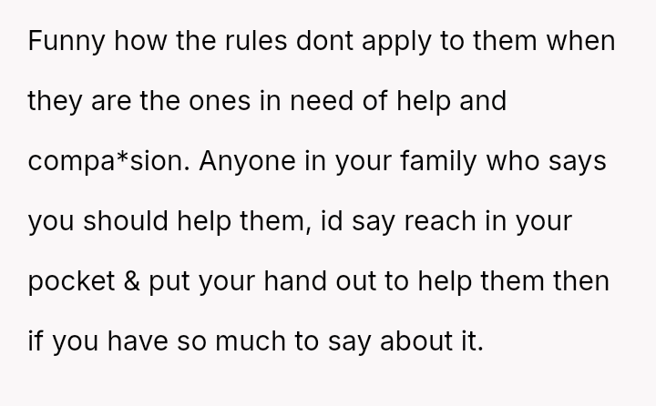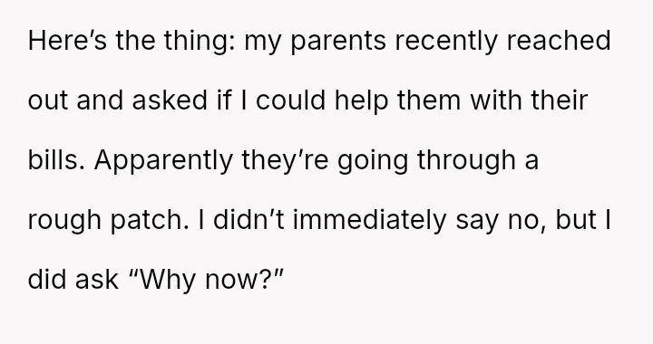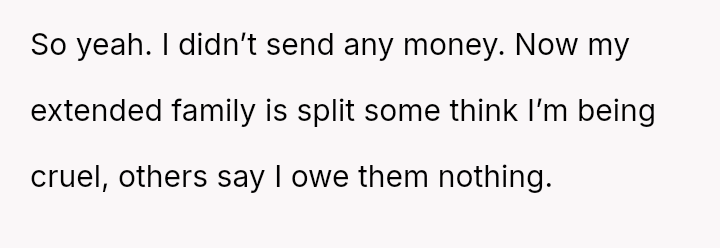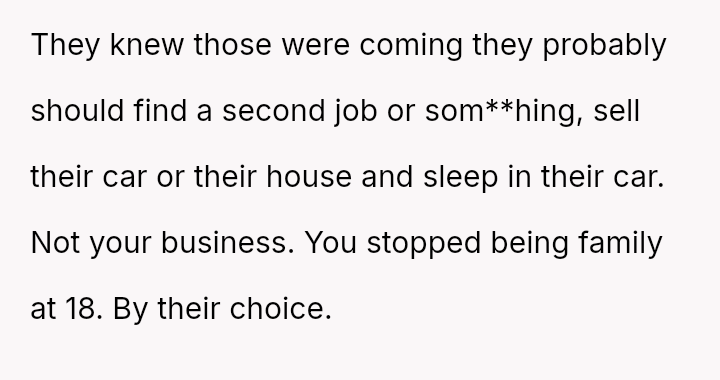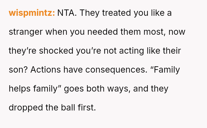 While the parents now seek financial aid during their own hardship, the OP holds firm to the emotional injury of being forced to struggle alone, resulting in a refusal to provide support.