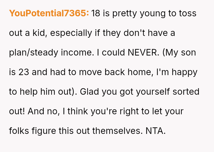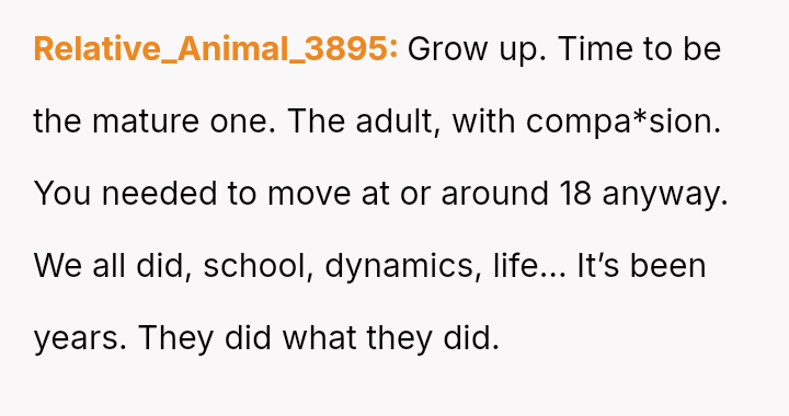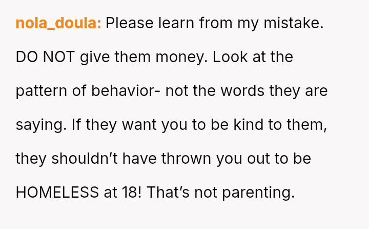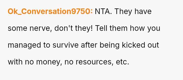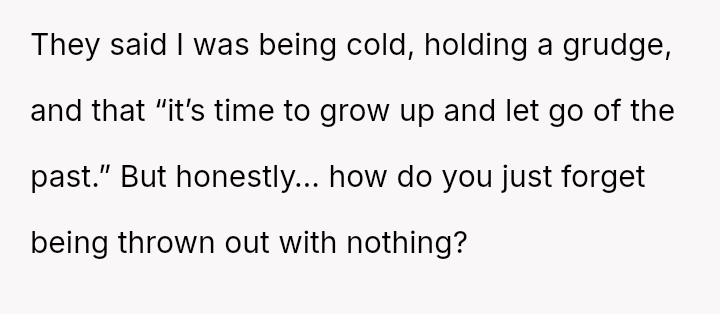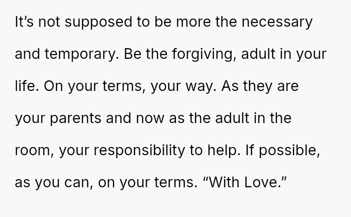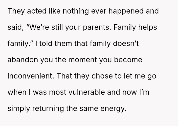 The original poster (OP) is grappling with a deep conflict stemming from past abandonment by their parents when they were legally an adult but entirely unprepared for independent life.