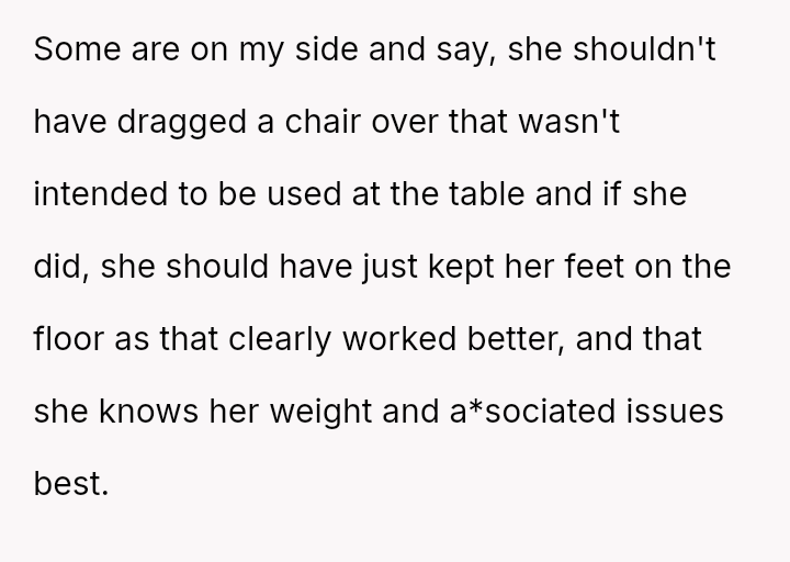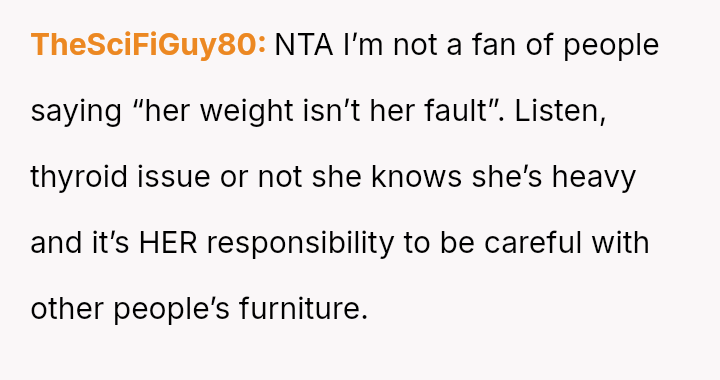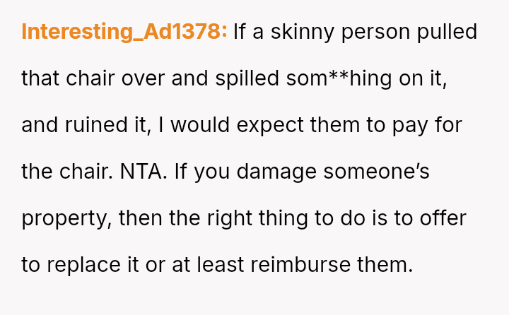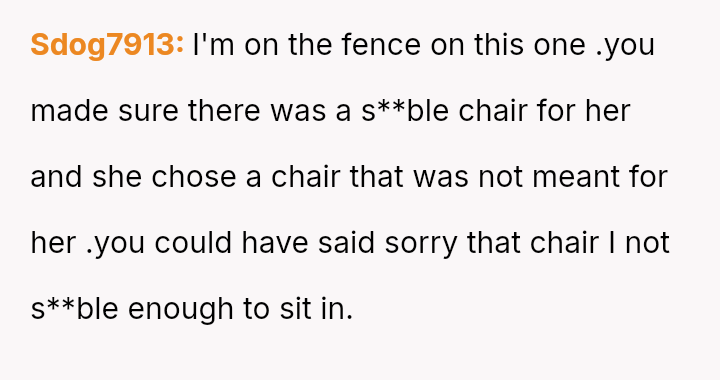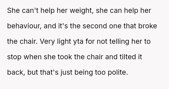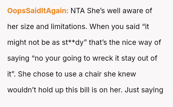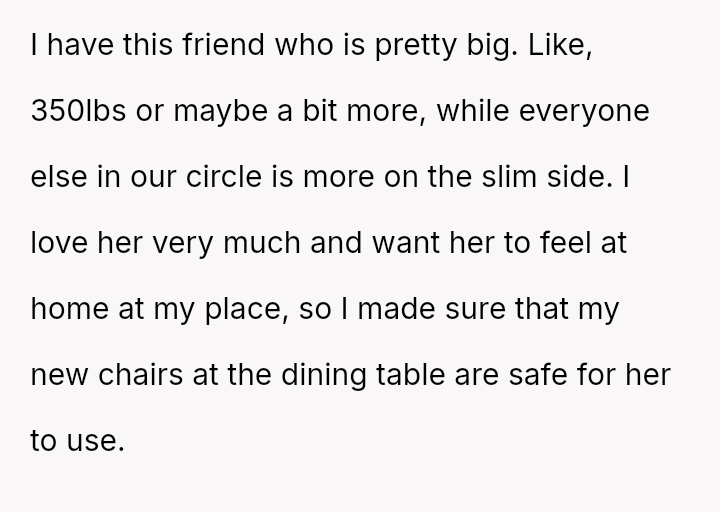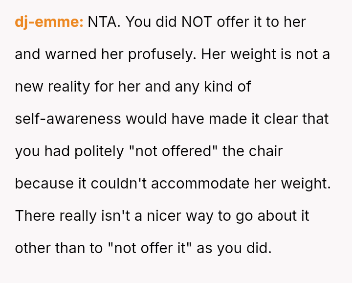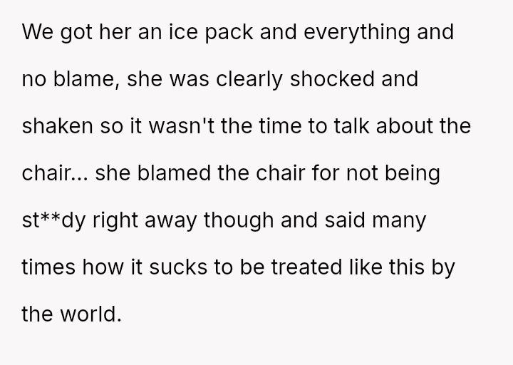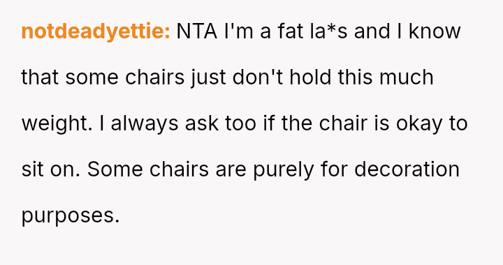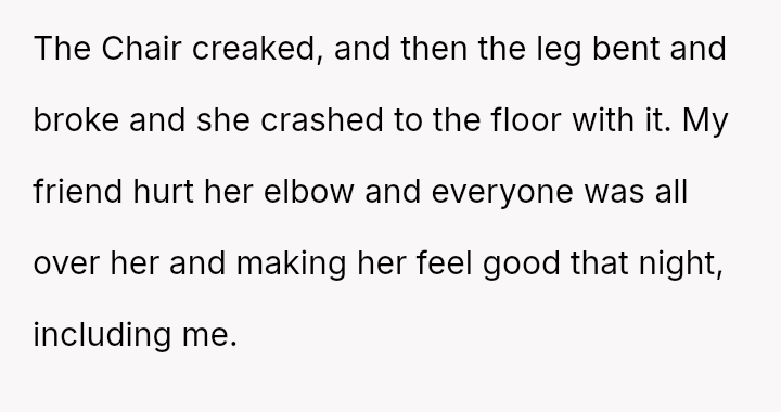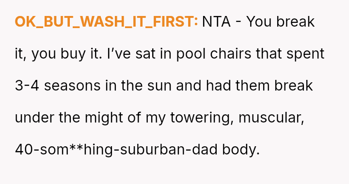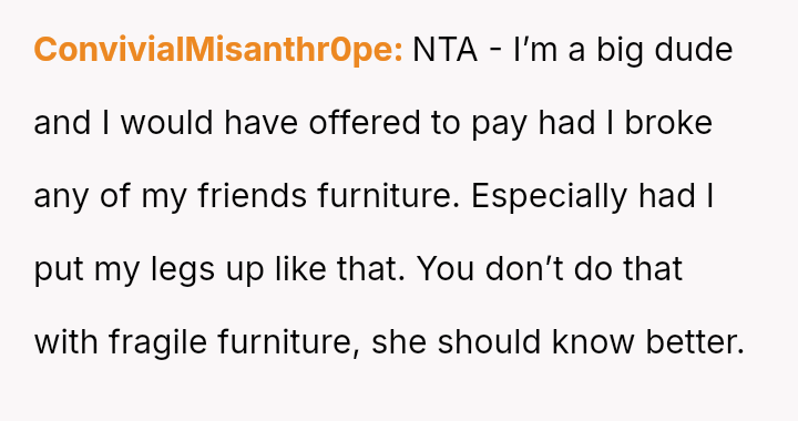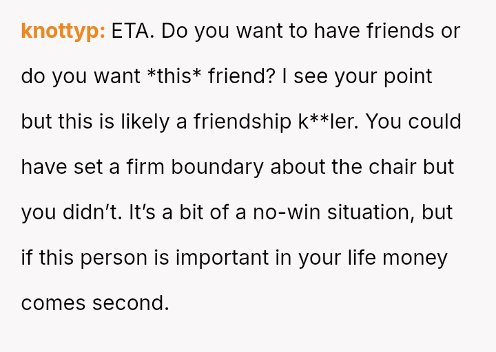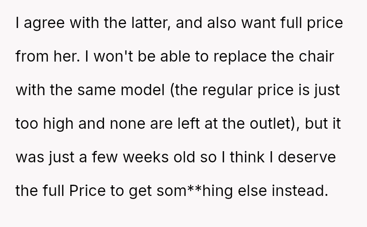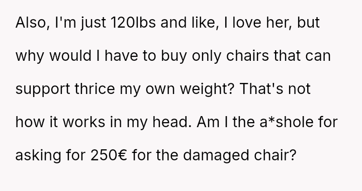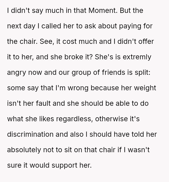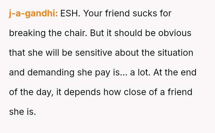 The original poster (OP) is facing conflict after a friend broke an expensive designer chair by attempting an uns**ble maneuver on it.