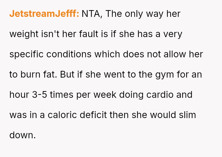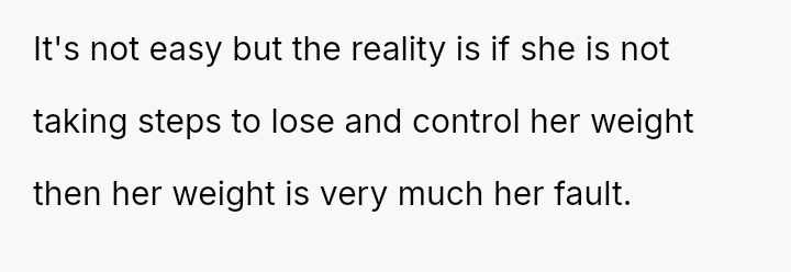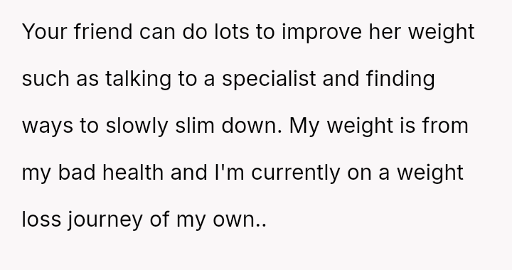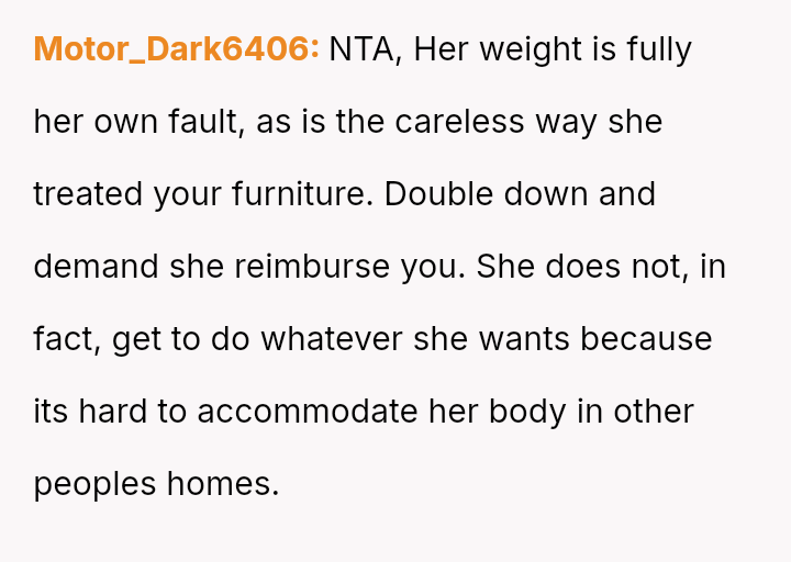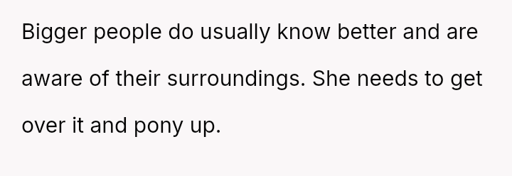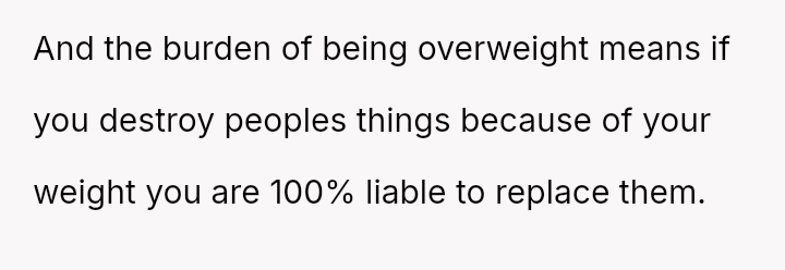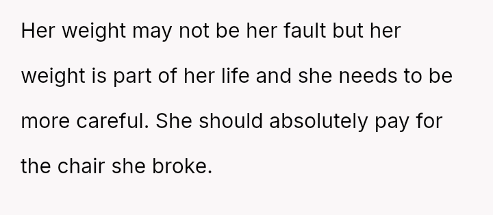 The central conflict lies between the OP's justified expectation for property damage compensation and the friend's perceived feeling of being discriminated against or blamed for her weight.