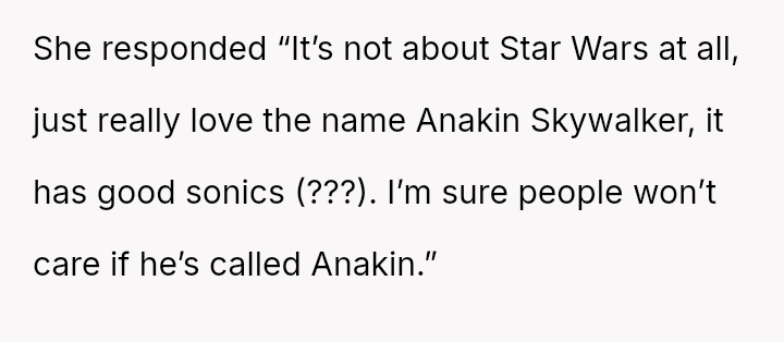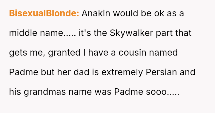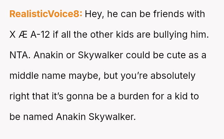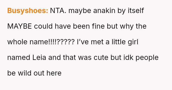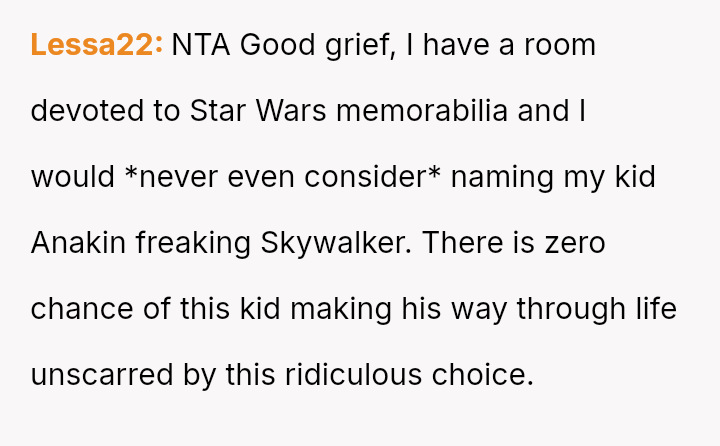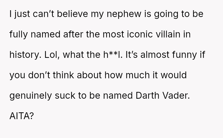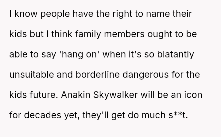 The original poster (OP) is deeply concerned about the potential social and emotional hardship their young sister's newborn nephew will face due to the chosen name, Anakin Skywalker.