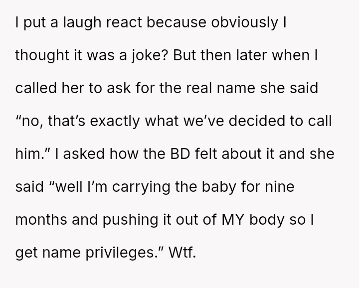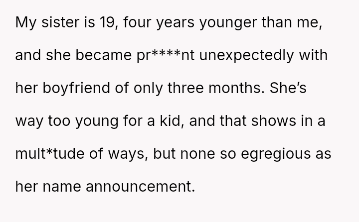 The central conflict arises from the OP's direct, critical reaction versus the sister's a*sertion of unilateral decision-making power over the child’s name, which she justified based on her physical role in the pregnancy.