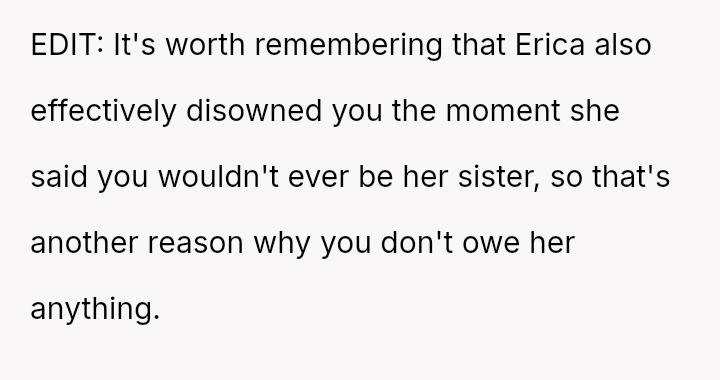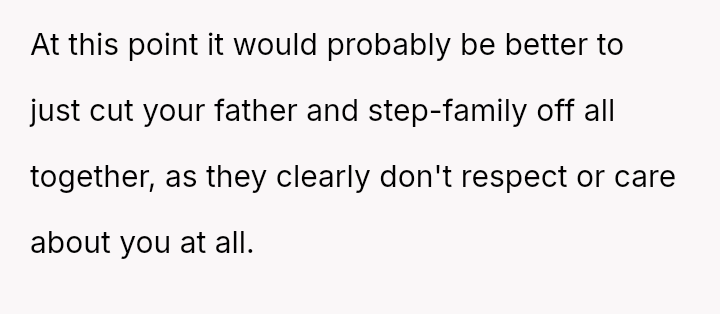 This conflict is rooted deeply in years of past mistreatment and exclusion by Erica, which has strained the OP's relationship with their father and the wider stepfamily.
