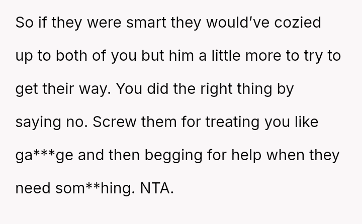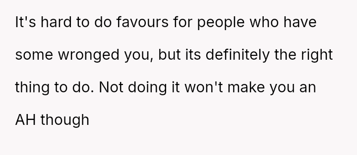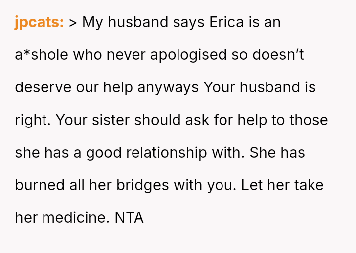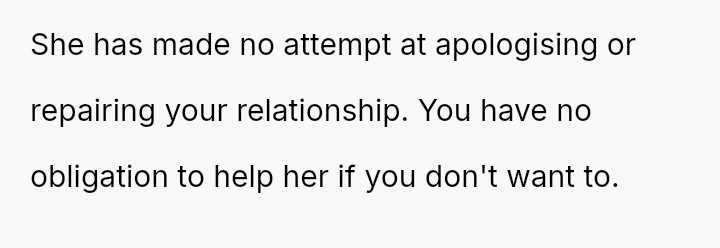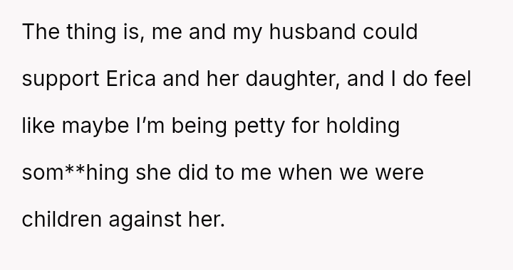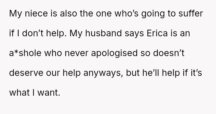 The OP acknowledges feeling conflicted, weighing past hurts against the immediate need of their niece, while their financially secure husband supports their refusal.