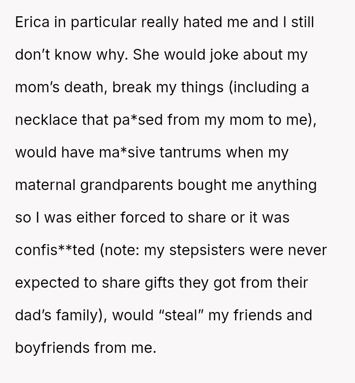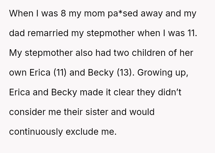 When her father remarried, the promise of family turned cold as her stepmother’s daughters, Erica and Becky, drew sharp lines of exclusion, turning family gatherings into battlegrounds of rejection and cruelty.