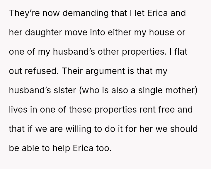 The original poster (OP) is facing significant pressure from their family to provide housing for their stepsister, Erica, and her daughter, due to the parents' financial difficulties.