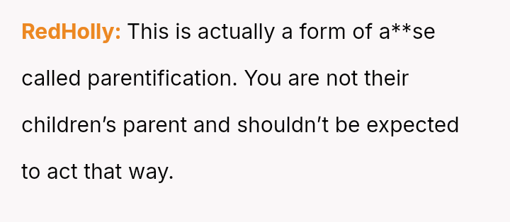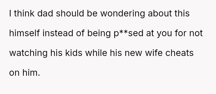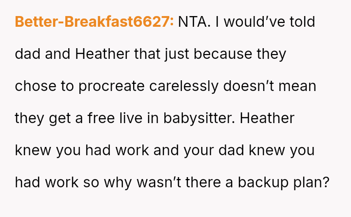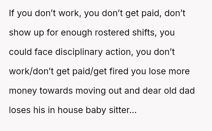 The original poster is facing a conflict between his commitment to his job, which serves as his exit strategy from the current living situation, and the expectations placed upon him by his father and stepmother to prioritize family obligations, specifically childcare for his younger half-siblings.