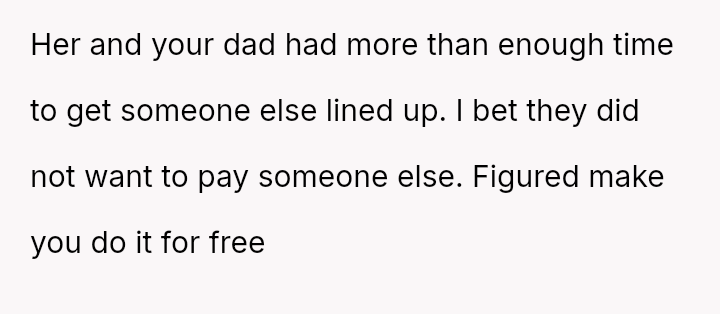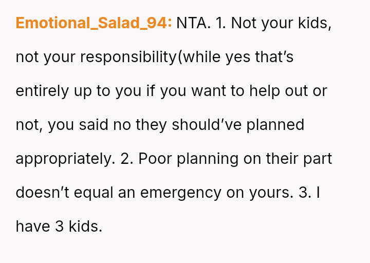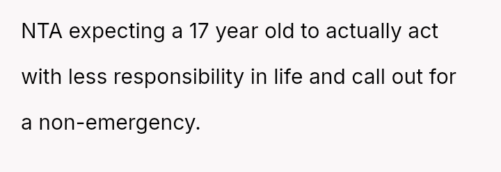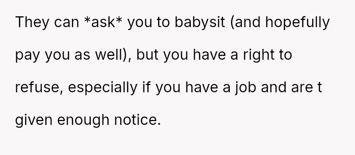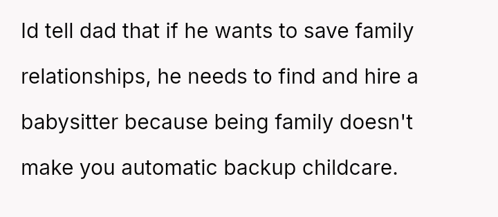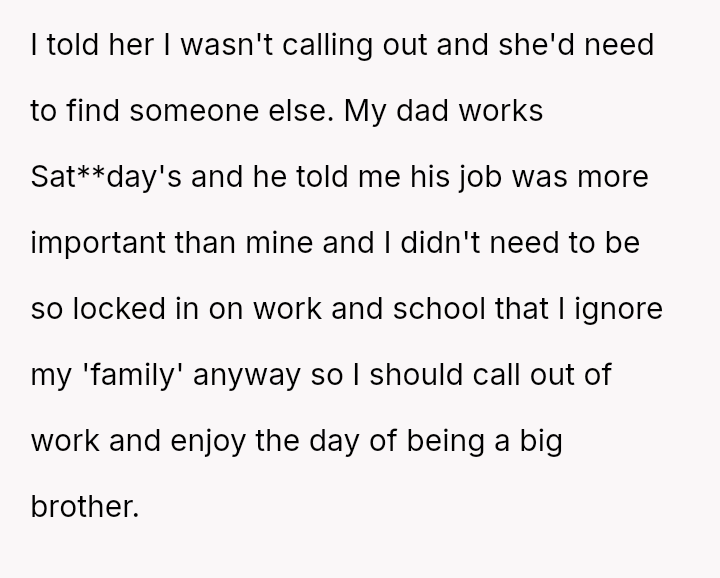 The OP refused, stating they needed to find someone else. The OP's father later told him his job was more important than the OP's, that the OP should enjoy being a big brother, and pressured him to call out.