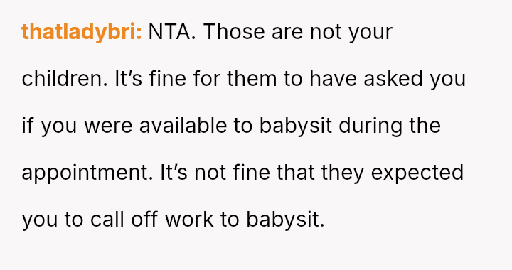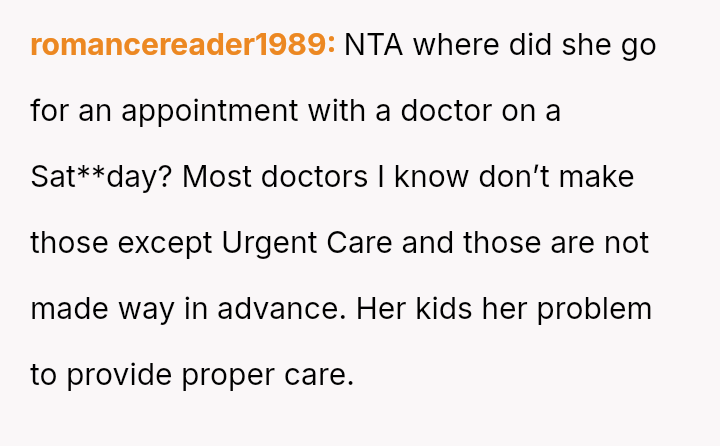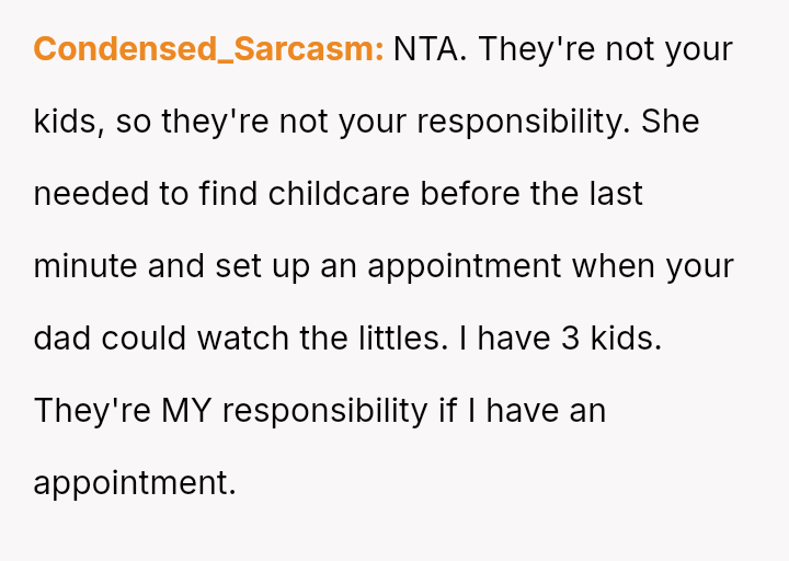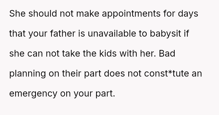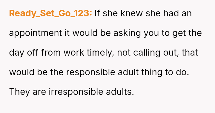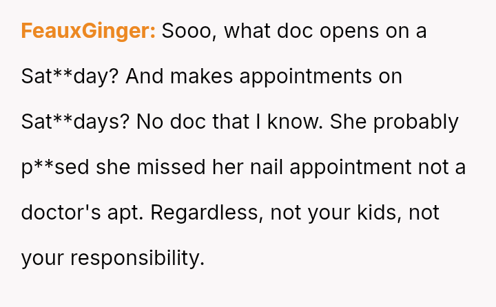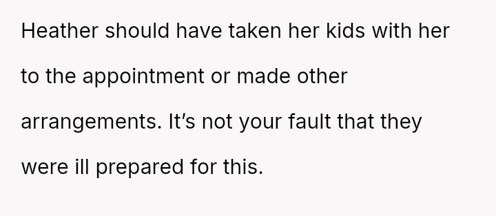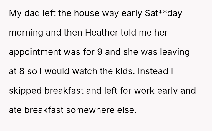 When Sat**day arrived, Heather insisted the OP watch the children starting at 8 AM for her 9 AM appointment. Instead, the OP left early for work, skipping breakfast at home.