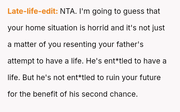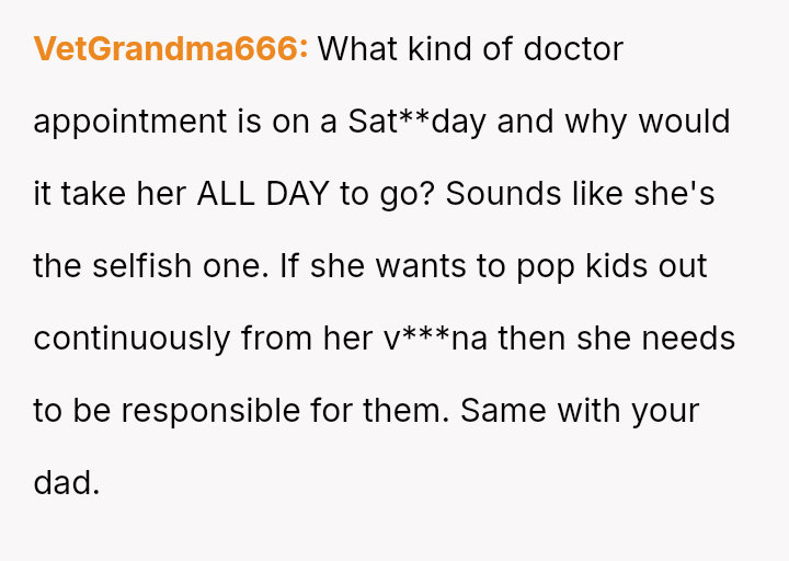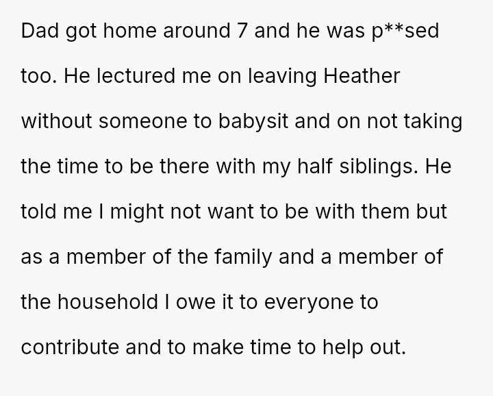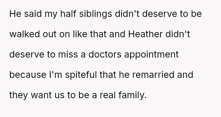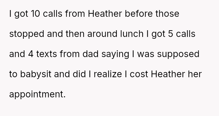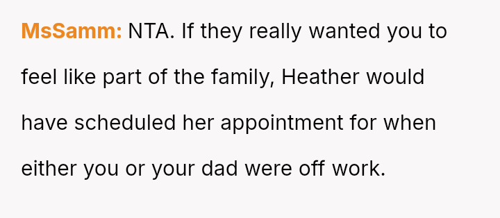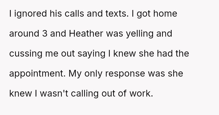 Upon returning at 3 PM, he faced yelling from Heather and later a lecture from his father about missing the appointment, but the OP remains resolute in his decision and feels no regret.