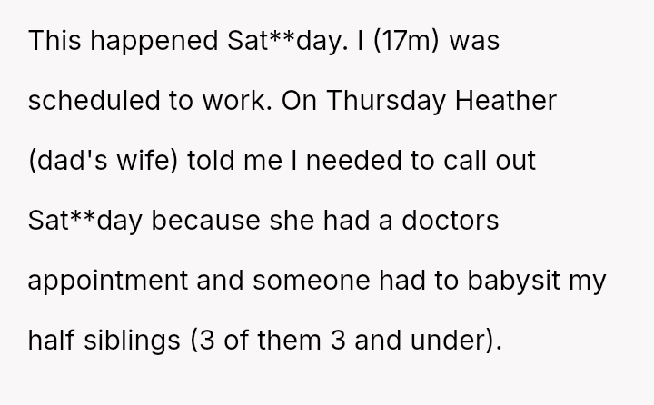 On Thursday, his father's wife, Heather, informed him that he needed to call out of work because she had a doctor's appointment and someone needed to watch their three young half-siblings (all aged 3 and under).