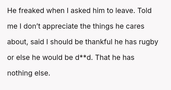 The central conflict lies between her justifiable need for a balanced partnership and her boyfriend's seemingly absolute prioritization of rugby, to the point where he equates its removal with a threat to his very existence.