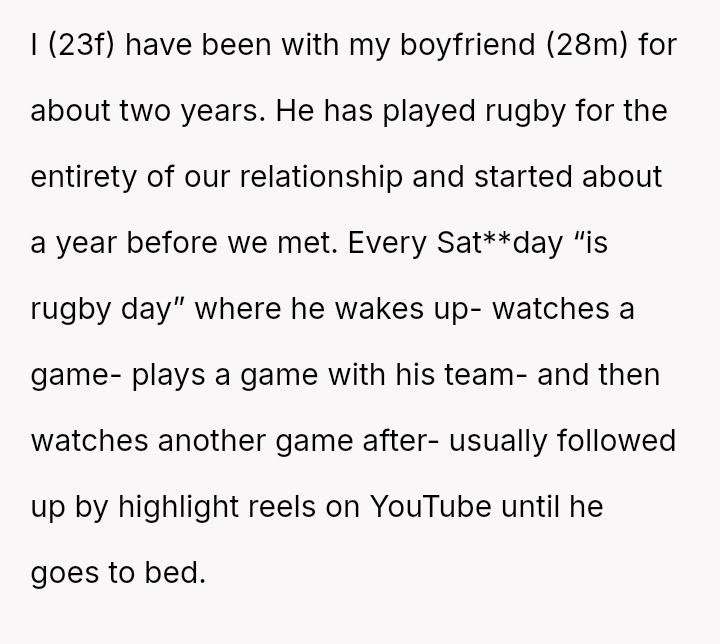 The original poster is experiencing significant emotional distress due to the overwhelming presence of her boyfriend's rugby commitment, which has negatively impacted their relationship milestones, financial s**bility, and her personal care.
