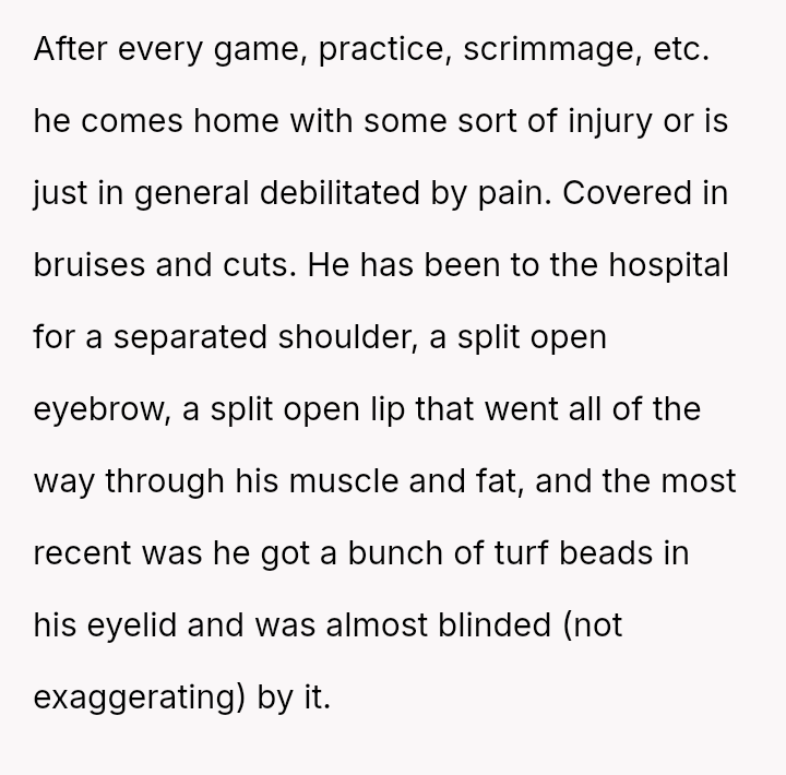 The sport, once a pa*sion, had become a ruthless third presence in their relationship, leaving her feeling sidelined and unheard. With each bruise and hospital visit, her worry deepened, morphing into a desperate plea for change.