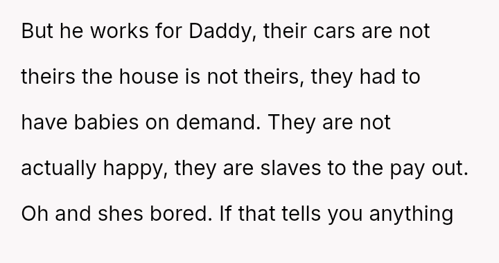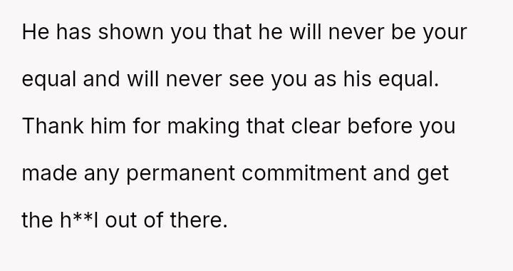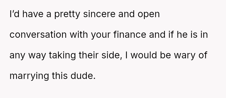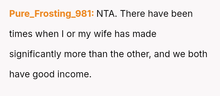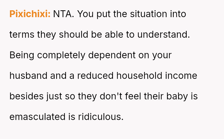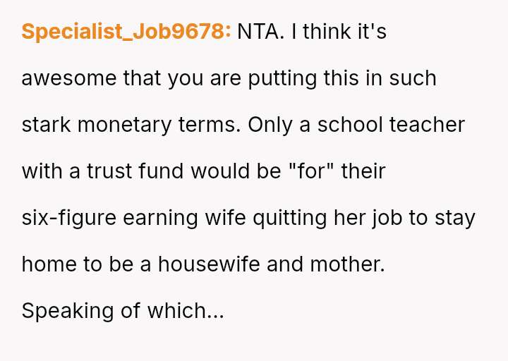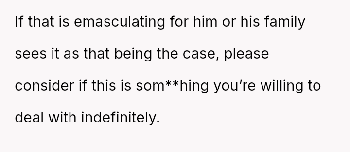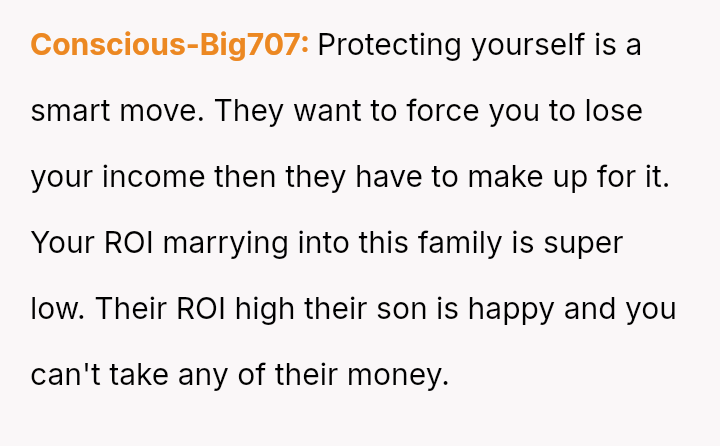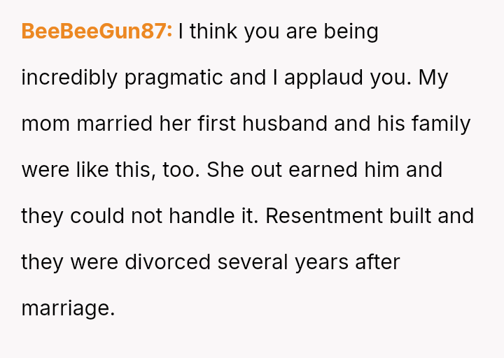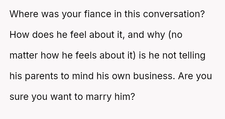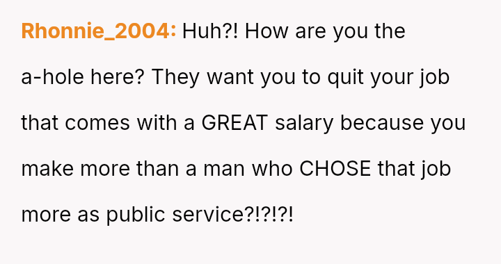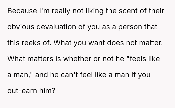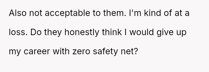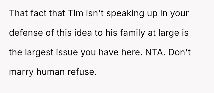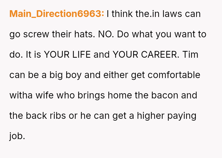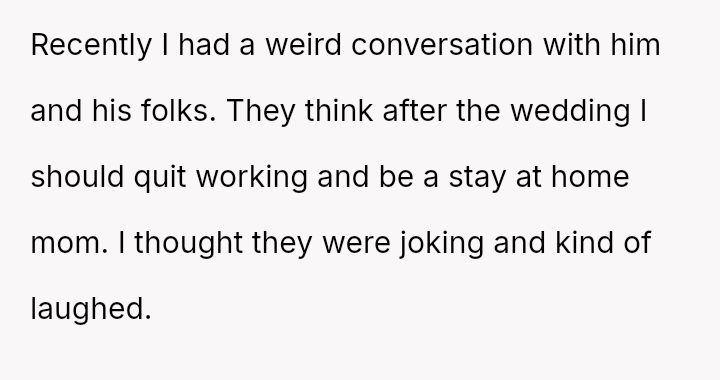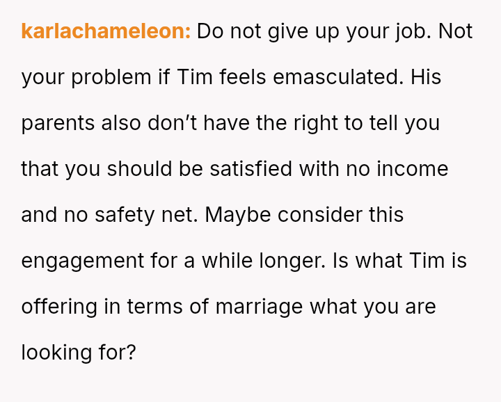 Recently, Tim's parents seriously suggested that the OP should quit her job after the wedding to become a stay-at-home mother, stating they find it embarra*sing that she currently earns more than Tim.