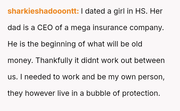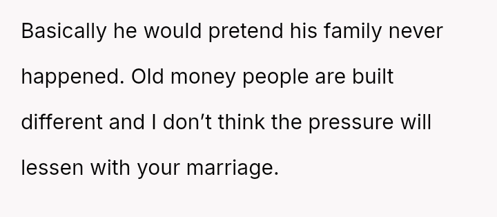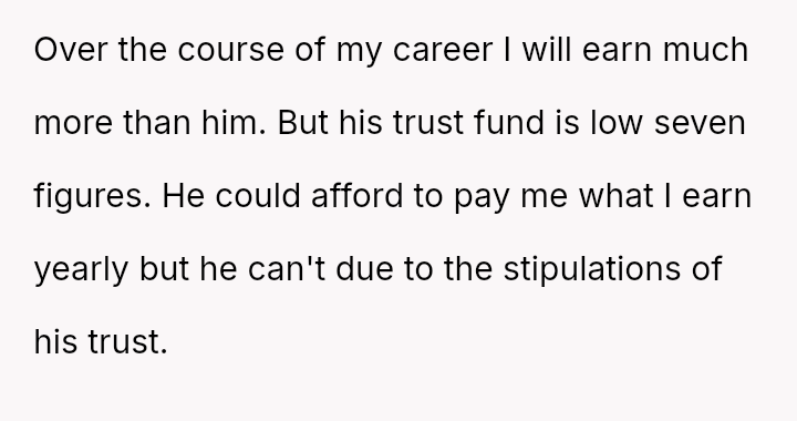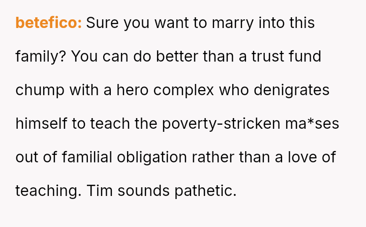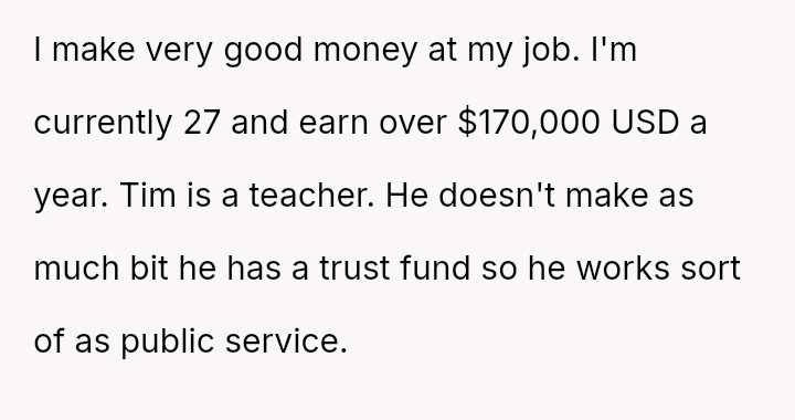 The original poster (OP), a 27-year-old earning over $170,000 USD annually, is engaged to Tim, whose family possesses significant wealth described as "old money." The OP has a successful career, while Tim is a teacher whose income is supplemented by a trust fund, aligning with his family's tradition of public service.