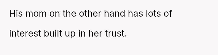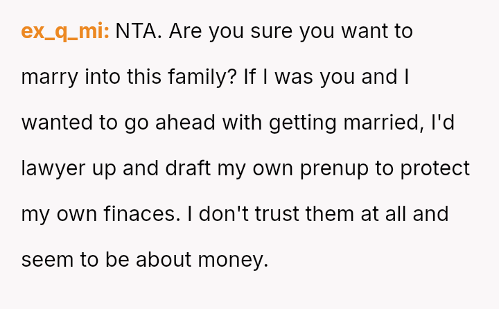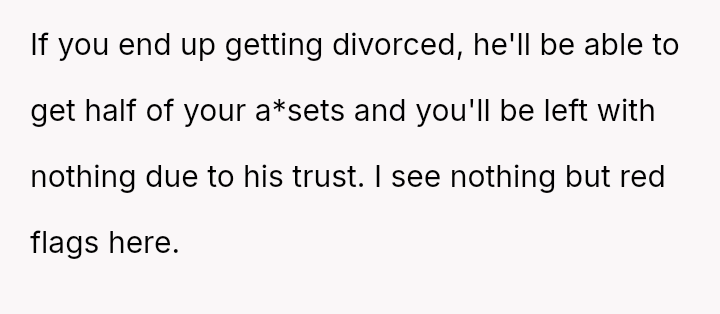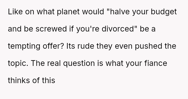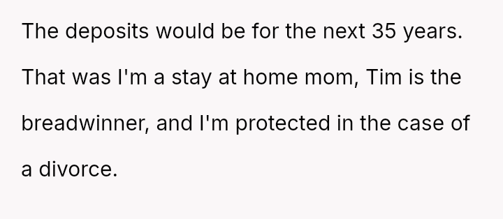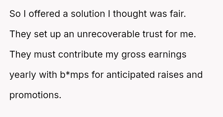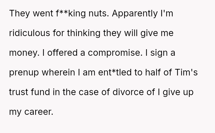 When the OP proposed a solution—an unrecoverable trust funded by the parents to cover her lost earnings for 35 years—or a prenuptial agreement guaranteeing half of Tim's trust in case of divorce, the parents reacted with anger.