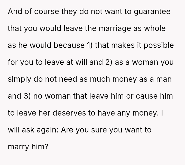 The OP is now uncertain whether her demands for financial security are reasonable, especially since her own mother found her approach too focused on money.