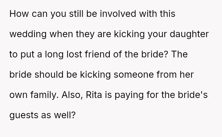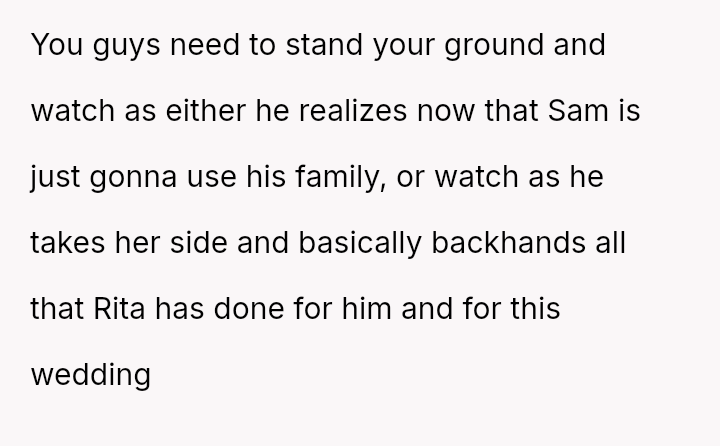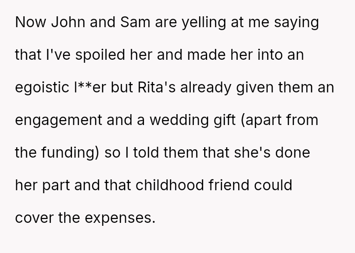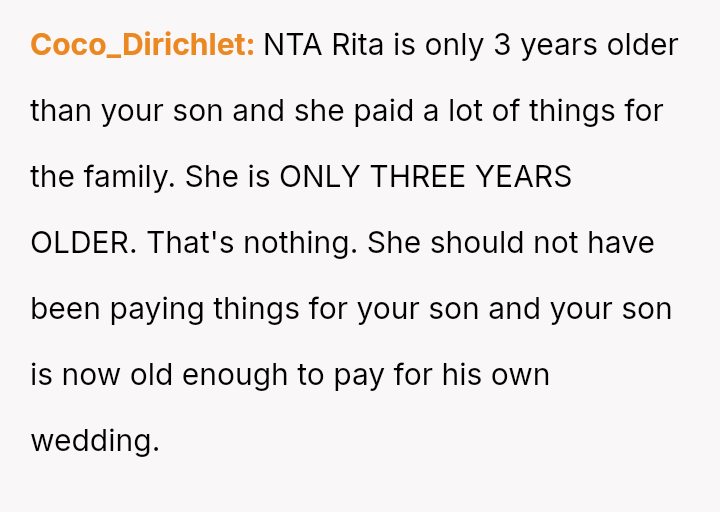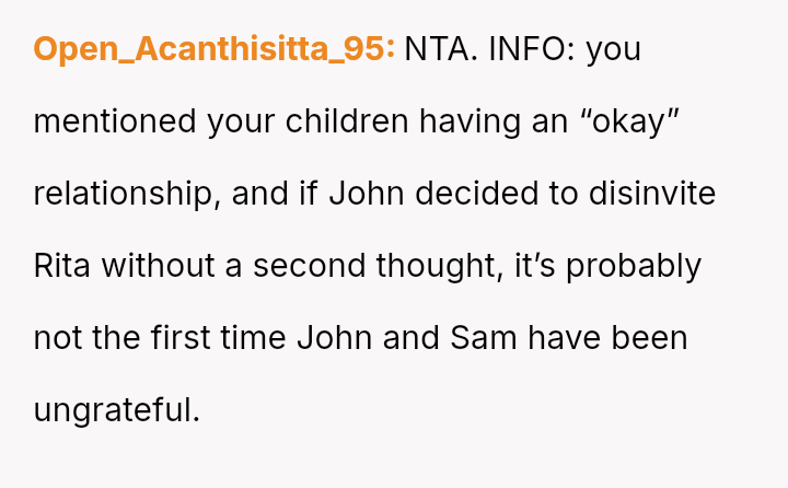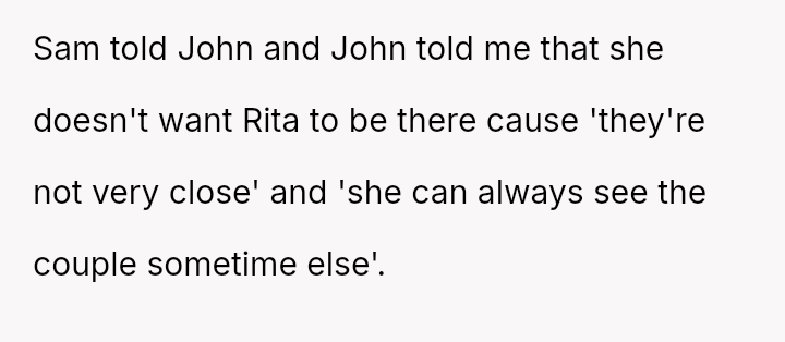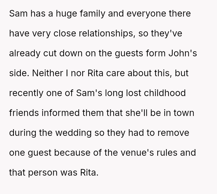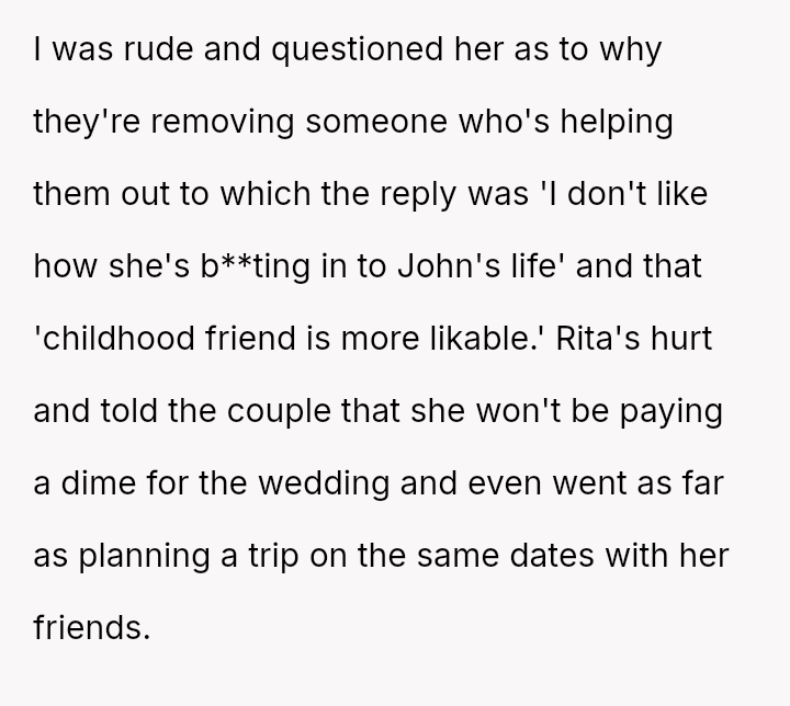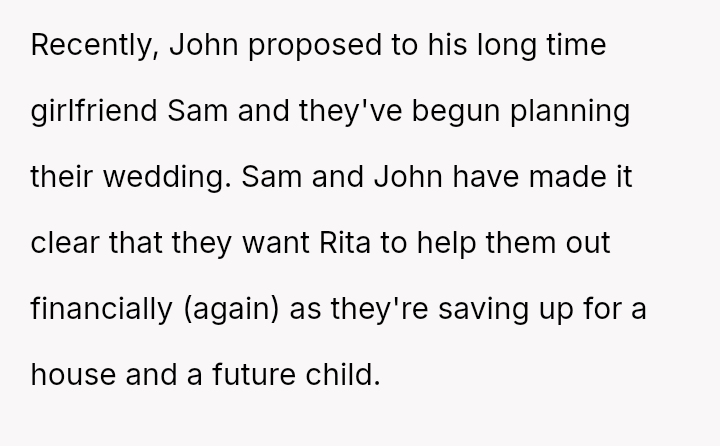 The central conflict arises when John and his fiancée, Sam, exclude Rita from the wedding after receiving significant financial support from her, citing personal preference over the benefactor's contribution. The OP stands by Rita's decision to withhold further financial aid and maintain her boundaries.