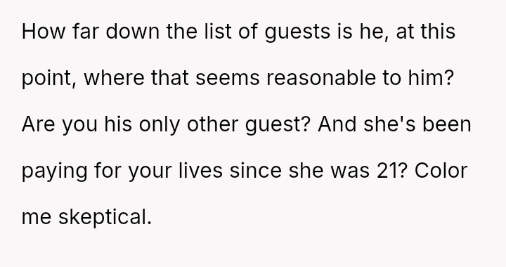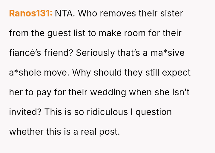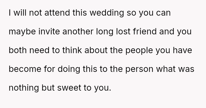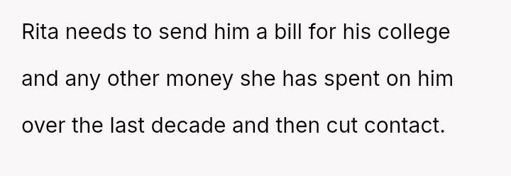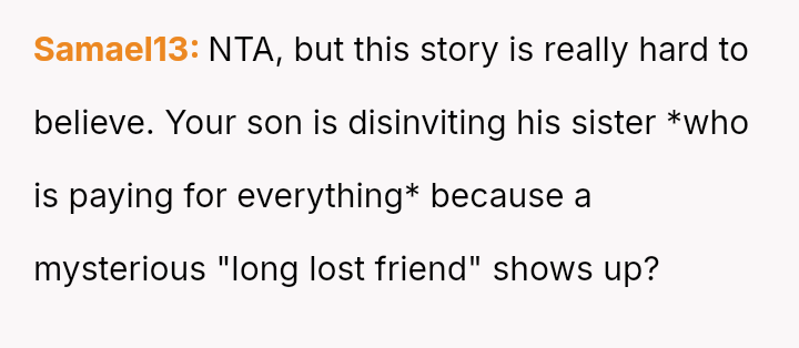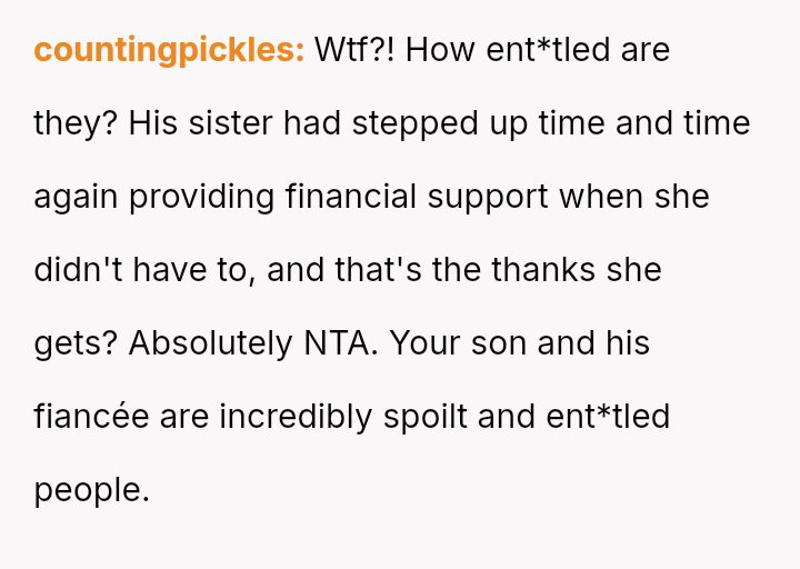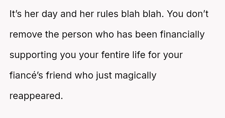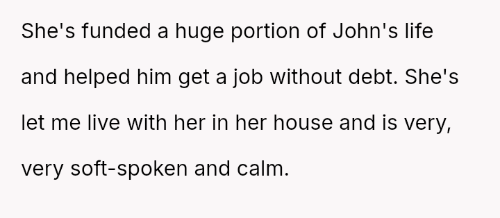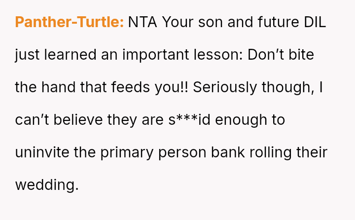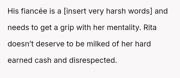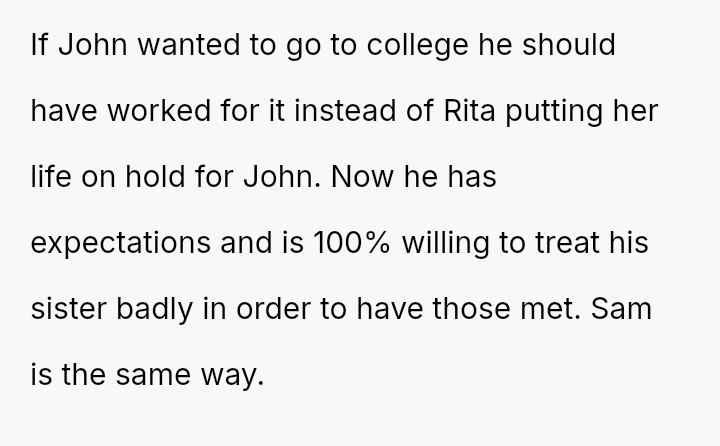 The central conflict arises when John and his fiancée, Sam, exclude Rita from the wedding after receiving significant financial support from her, citing personal preference over the benefactor's contribution. The OP stands by Rita's decision to withhold further financial aid and maintain her boundaries.