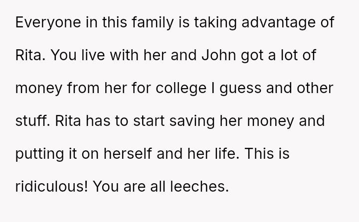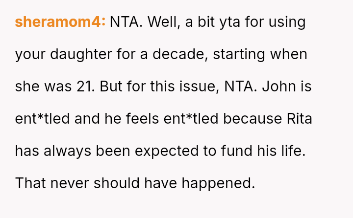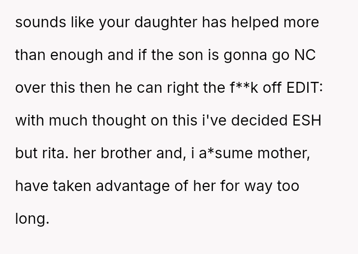 The original poster (OP) is defending their daughter, Rita, who has been the primary financial provider for the family for nearly a decade.