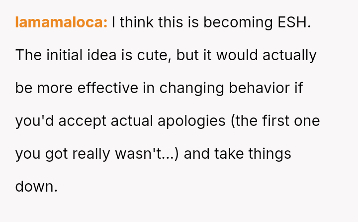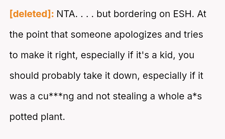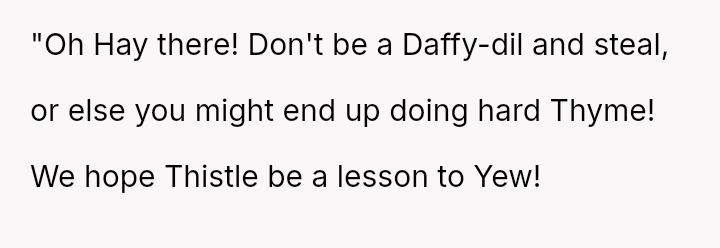 Was creating a highly visible, pun-filled poster naming and shaming individuals for petty theft of garden items a justifiable defense of property, or did it cross the line into inappropriate public h***ssment and escalation?